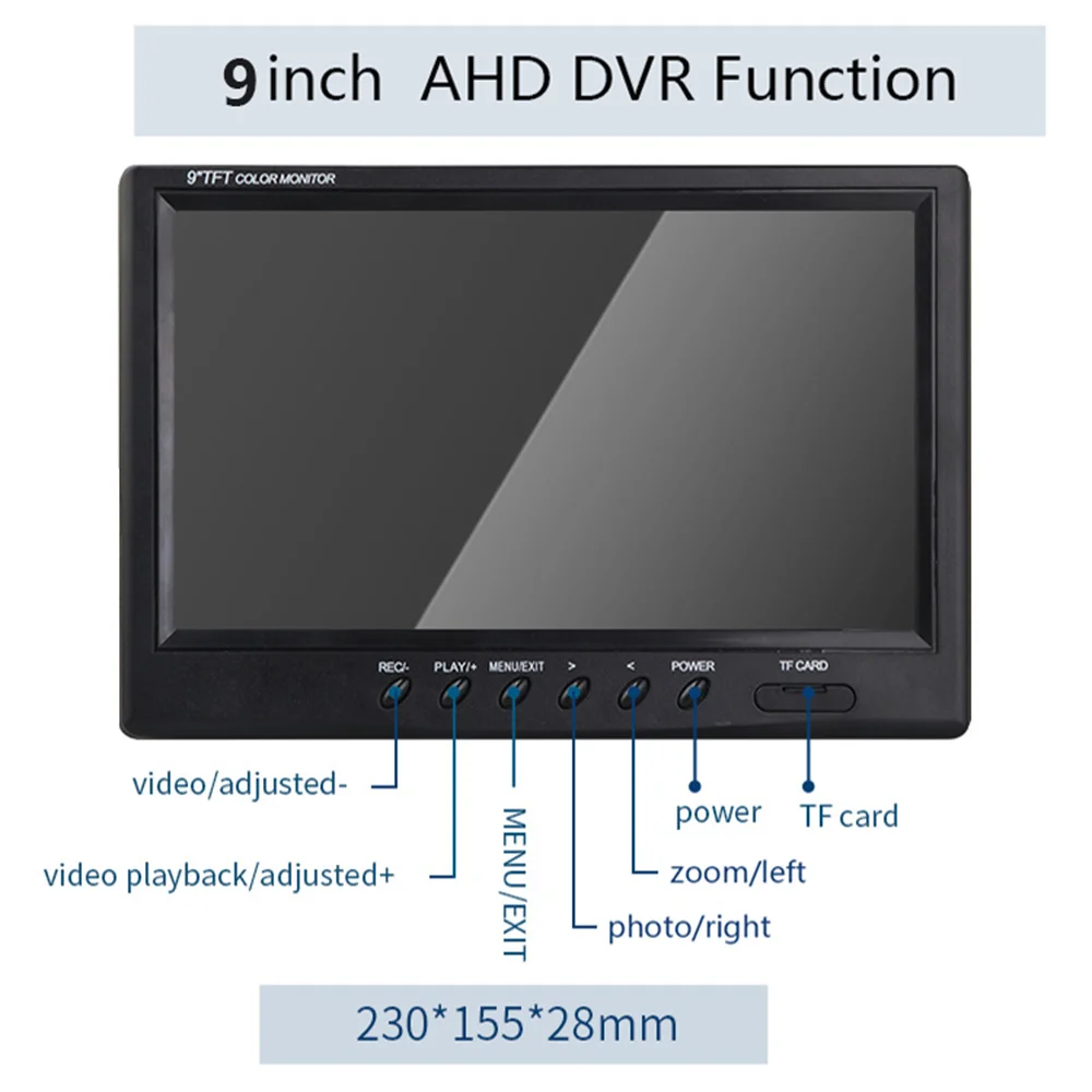 1. Монитор: 9 дюймов IPS цветной монитор записи с солнцезащитным козырьком для яркой окружающей среды снаружи