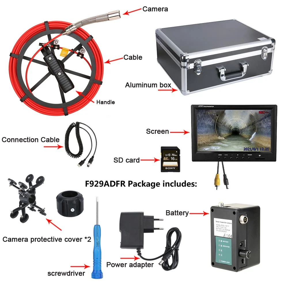 Профессиональная камера для проверки трубопроводов/канализационных труб разработана с 9 дюймовым цветным ЖК-монитором IPS с солнцезащитным козырьком для наружных проверок. Материал, из которого изготовлен провод стержень из стекловолокна (диаметр: 4,9 мм), анти-коррозия/машина для изготовления холодного/растяжению.