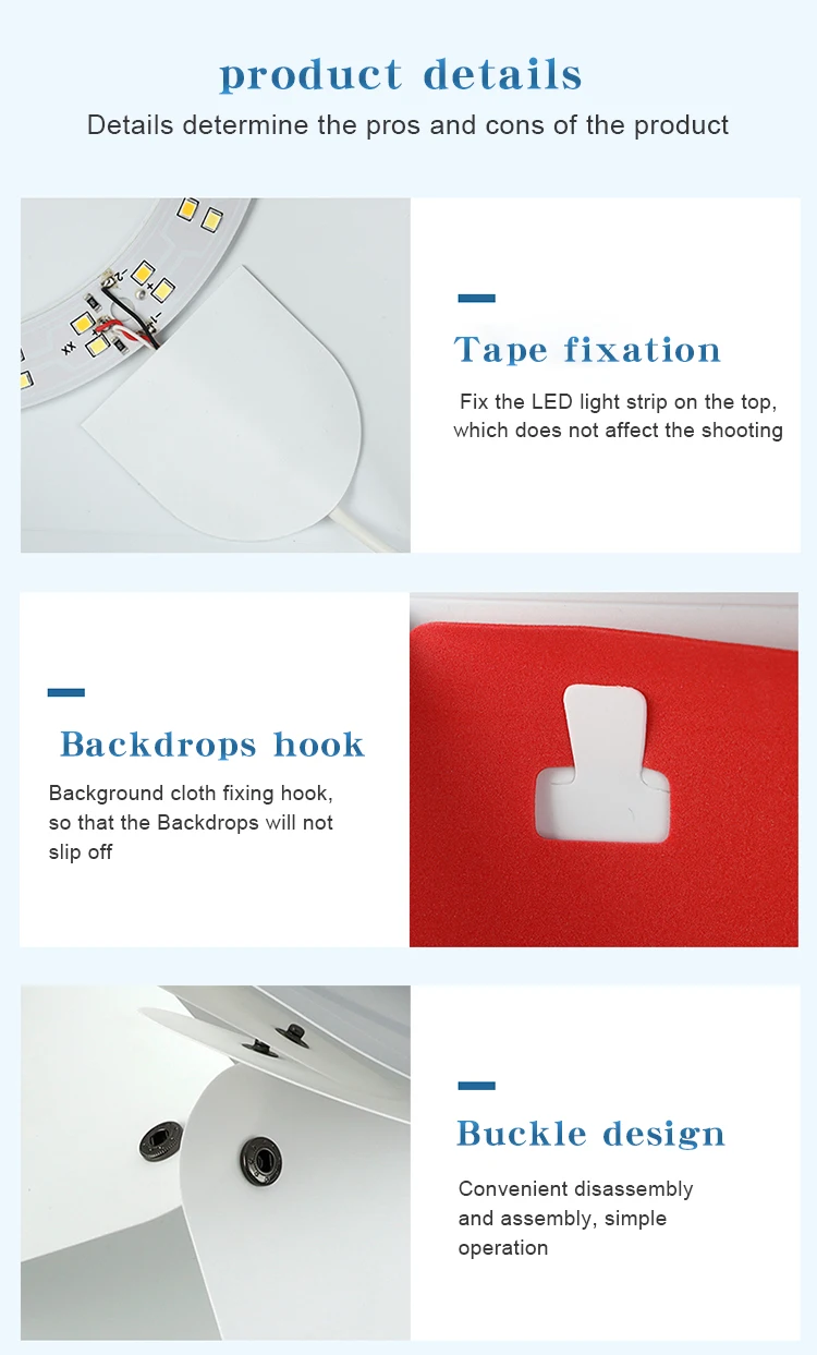 4. Портативная складная конструкция магнитной цепи, более удобная в установке и переноске, Встроенный светодиодный светильник, обеспечивающий средний Светильник, предотвращает появление теней и отражений на фотографиях.