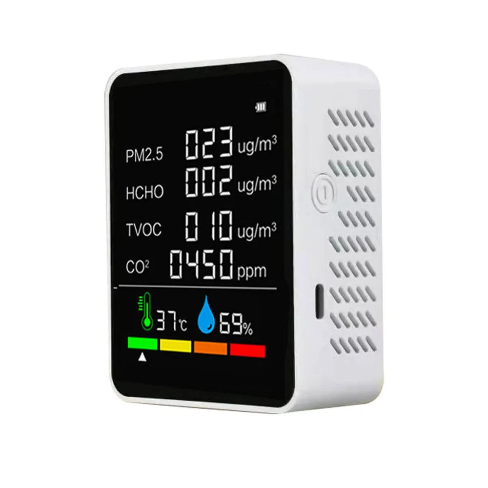 Большой цветной ЖК-дисплей с подсветкой, вы можете видеть количество электроэнергии, значение CO2, значение TVOC, значение HCHO, температуру и влажность четко.