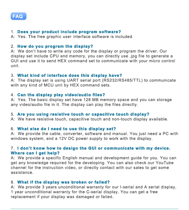 Model number:DMG80480C040_03WMain Features:* DWIN T5L ASIC HMI intelligent HMI LCD touch screen for commercial grade applications* 4.0 inch, 800x480 IPS TFT LCD, 16.7M Colors* G+G capacitive touch panel for indoor using, support finger touch, pen touch, glove touch, water proof tocuh, sensitivity adjustable for the use of front tempered glass or acrylic panel* Industrial grade 4 wire resistive touch panel for option* Reserved WIFI module, build in buzzer* T5L ASIC support DWIN OS or C++ language secondary development* DWIN T5L DGUS II development software kit and development guidance needed
