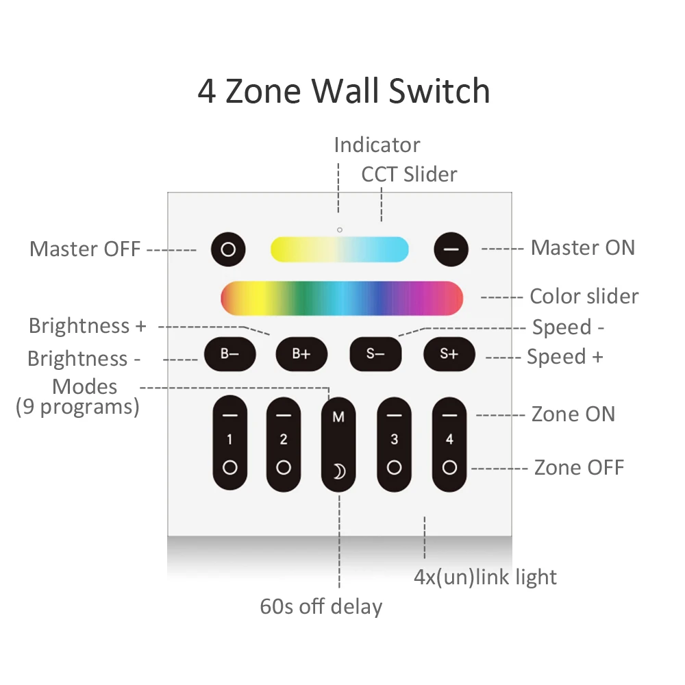 Есть пять режимов для подключения к светодиодной ленте: RGBCCT/RGBW/RGB/CCT/Dimmer, и различные цветовые индикаторы соответствуют различным функциям.