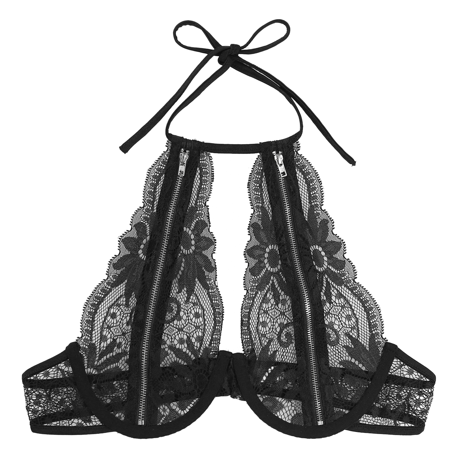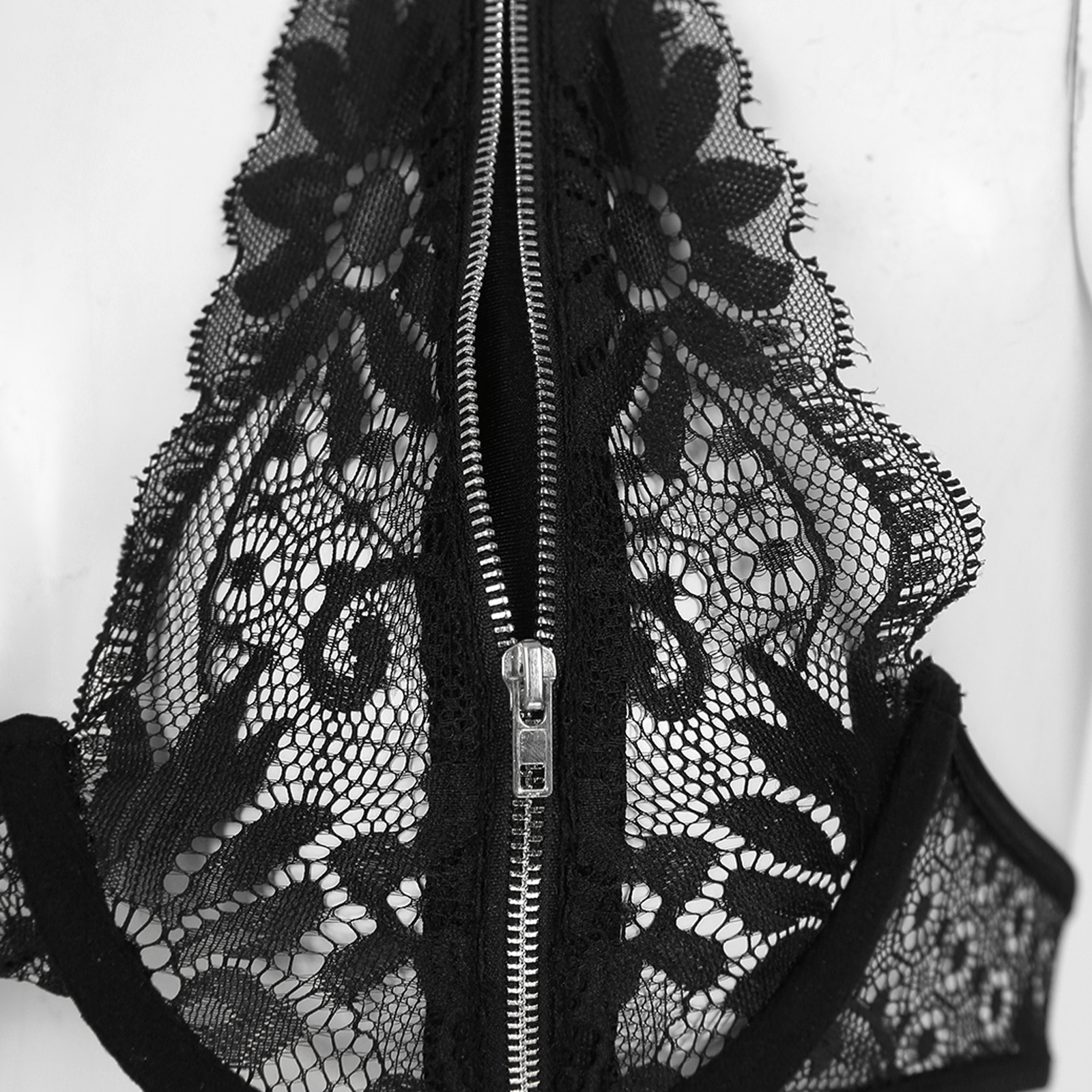 Холтер со шнуровкой, прозрачный кружевной дизайн, спереди с украшением на молнии, сзади с застежкой на крючок и глаза.
