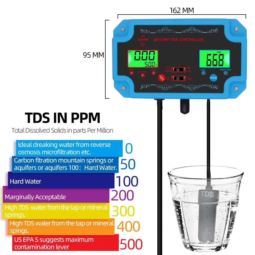 ПараметрыДиапазон измерения: pH: 0,00-14.00PHОРП: 0 ~ ± 1999 мВТемпература: -50 ℃-70 ℃ (-58 ℉-158 ℃)Разрешение: PH: 0.01PHОРП: 1 мВТемпература: 0,1 ℃ (0,2 ℉)Точность: PH: ± O.1PHОРП: ± 5 мВТемпература: ± 1,0 ℃(± 2 ℉)Входное сопротивление: 10 ^ 12 ΩДиапазон набора: pH: 3,50 pH ~ 10,50 pHОРП:-500мВ ~ 500мВМощность: AC230V (AC110V)Рабочая температура: 0 ℃-50 ℃Релейный контакт: 5А/250В переменного тока