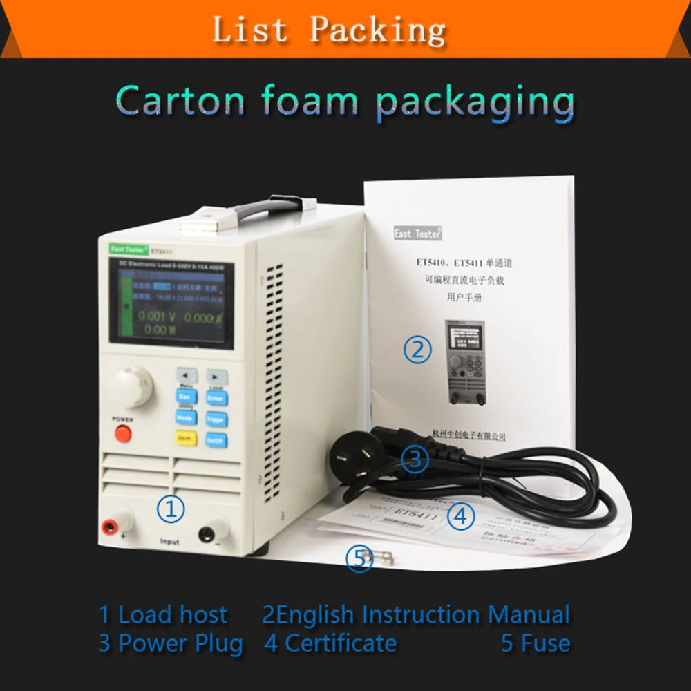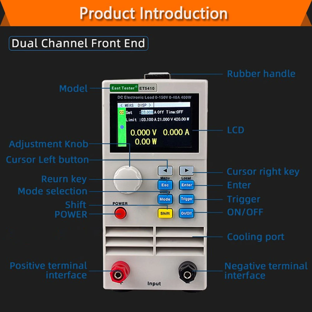 Серия ET54 DC программируемая электронная нагрузка обеспечивает 1МВ/10мв, 1мА/10мА высокое разрешение и точность с превосходной производительностью. Он оснащен 12 распространенными режимами и полными испытательными функциями, которые могут широко использоваться в зарядном устройстве, импульсном блоке питания, линейном блоке питания, батарее и других испытаниях производственной линии.