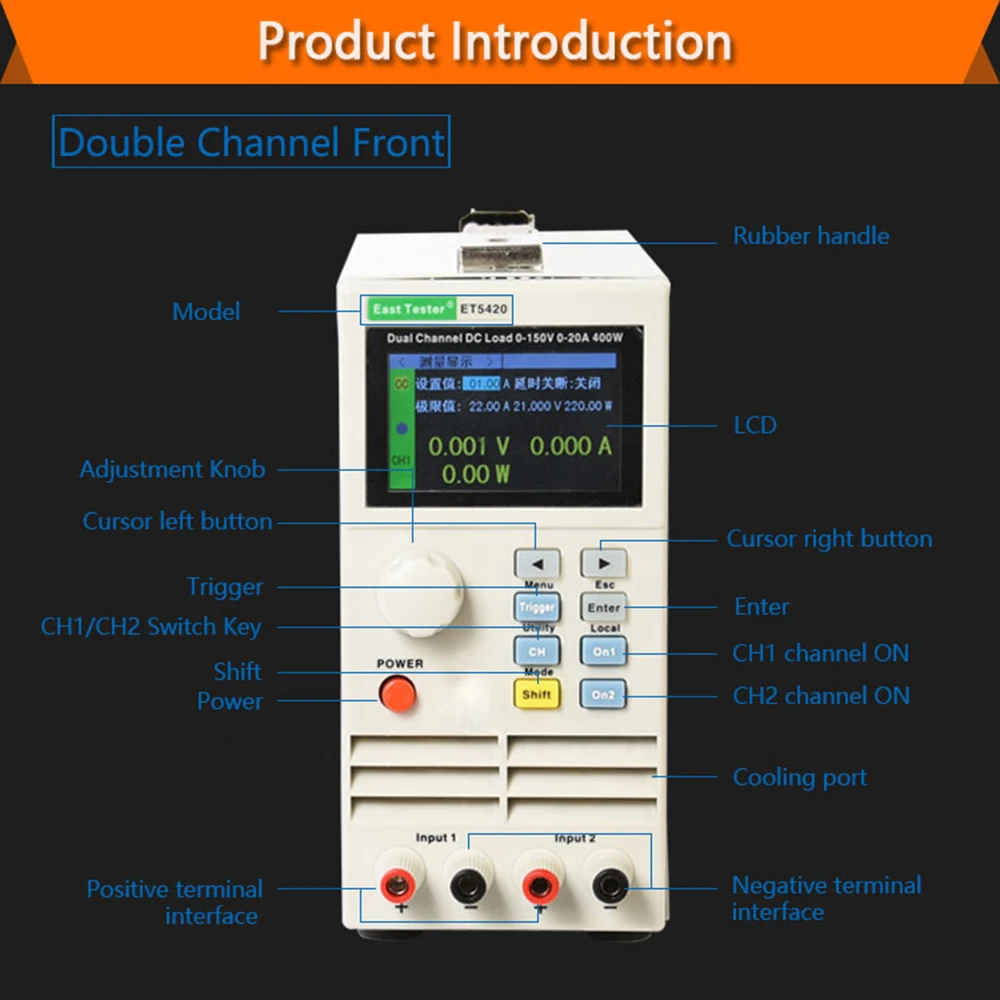ET54 DC программируемый электронный нагрузочный одноканальный/двухканальный 400 Вт 150 в 500 В CV CC CR CP режимы 2,8 "дюймовый инструмент для измерения напряжения тока
