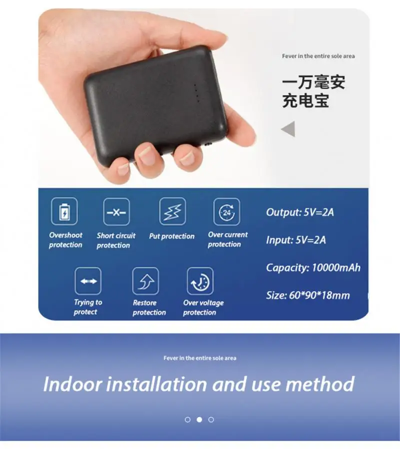 Ответ: время нагрева определяется в соответствии с продуктом с функцией хранения питания. Этот продукт не имеет блока питания и может быть подключен только для генерирования тепла. Если вы покупаете банк питания, вы можете нагреваться около 6 часов, или вы можете использовать банк питания самостоятельно. Убедитесь, что выходная мощность блока питания выше 5 В/2 А. Или купи 7,4 V литиевая батарея (может генерировать тепла для детей в возрасте от 9-10 часов)