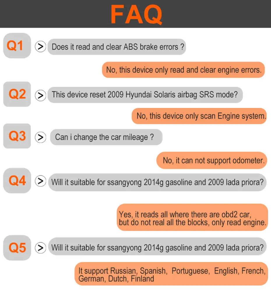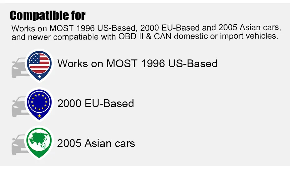 Несмотря на то, что он совместим с большинством автомобилей, но различные регионы поддерживают протокол OBD2 транспортного средства в разное время, или некоторые машины имеют специальный дизайн, поэтому он может не совместим с некоторыми автомобилями, которые не поддерживают протокол OBD2. Особенно японский и корейский автомобильный бренд.