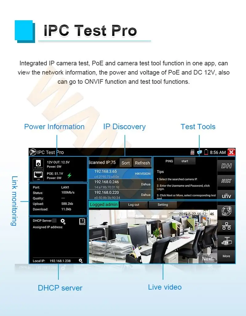● IPC test pro, автоматическое сканирование всех сегментов сети IP, автоматическое открытие питания PoE и отображение мощности. Введите имя пользователя и пароль, можете отсканировать Изображение камеры, активировать камеры. Перейти к интерфейсу ONVIF и испытательным инструментам.