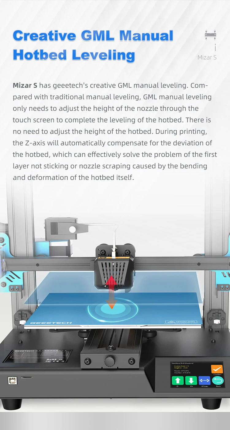 L Новое поколение MBL ручного выравнивания горячей кровати технологии, в ручном режиме выравнивания, принтер также может автоматически измерять наклон горячей кровати и автоматически компенсировать его во время печати, по сравнению с традиционным ручным выравниванием горячей кровати