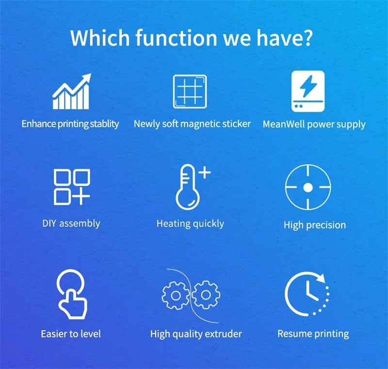 【MeanWell источник питания 】 мы используем MeanWell источник питания, который производится указанной компанией с развитой технологией, и он отвечает всем потребностям быстрого нагрева и длительного 3d-печати. Принтер защищен своим источником питания от шипов напряжения и отключений питания. При потере электрической энергии отпечатки могут быть восстановлены с последнего слоя, что экономит время и сокращает отходы.