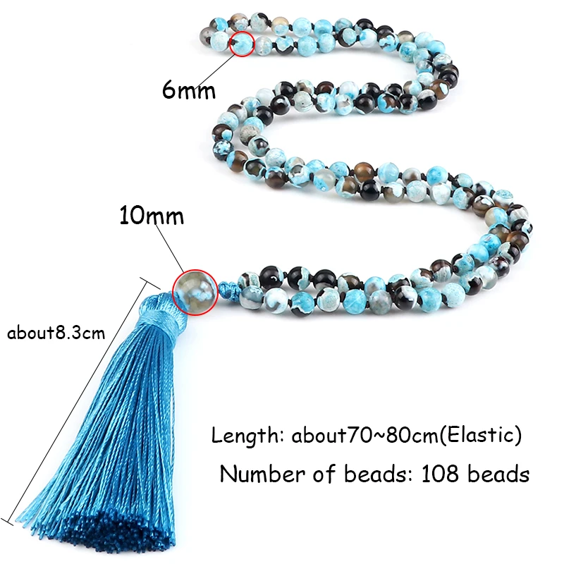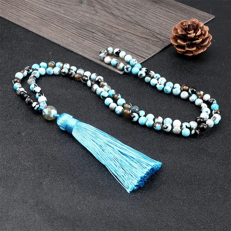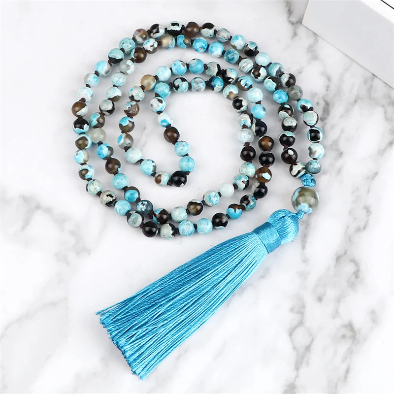 Женское и мужское богемное ожерелье, модное ожерелье из натурального голубого огненного камня и оникса 108 Mala, ожерелье с кисточкой, ручная работа, узелковые ювелирные изделия