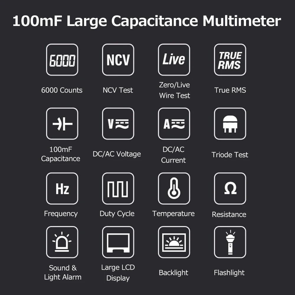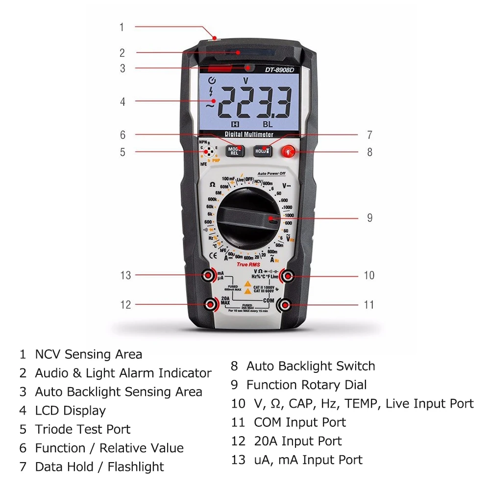 Другие особенности: живое решение провода, тест NCV, тест на непрерывность, звуковой сигнал и светильник, флэш-светильник и т. Д.