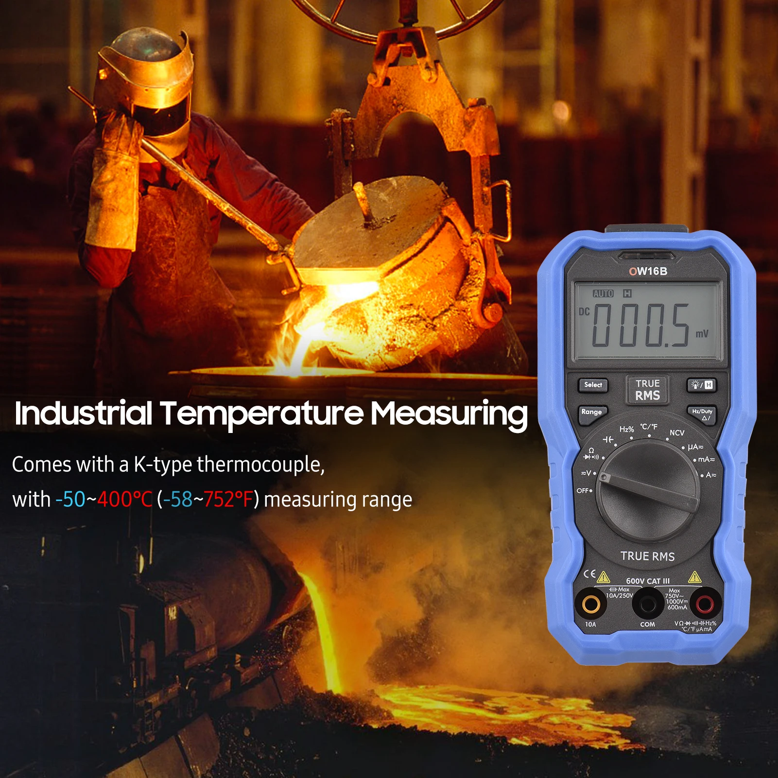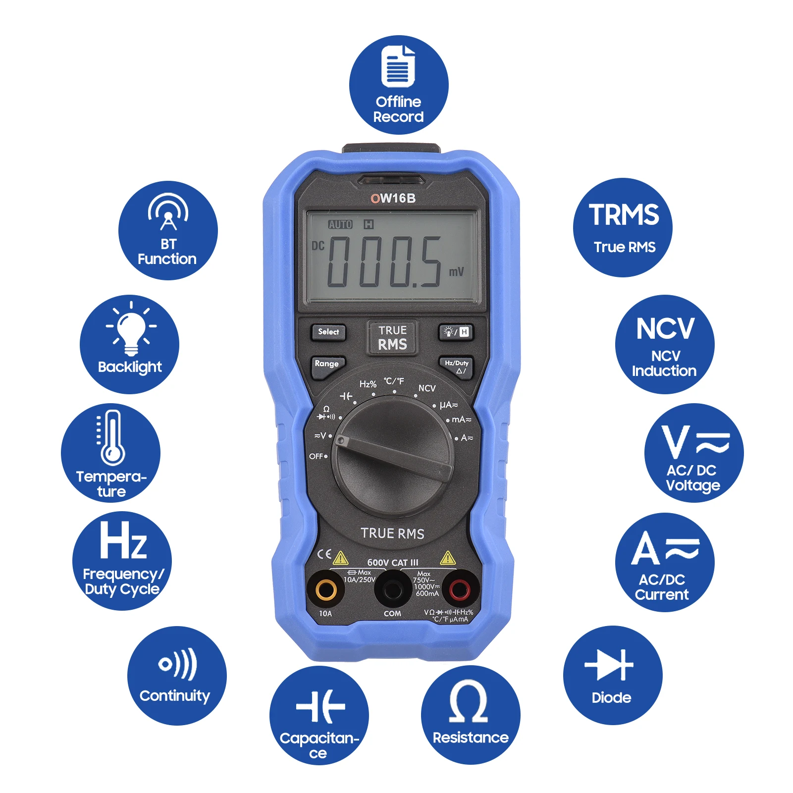 -С автоматическим диапазоном и ручным выбором, поддерживает измерение напряжения переменного и постоянного тока, переменного и постоянного тока, сопротивления, емкости, частоты, непрерывности, диодов и рабочего цикла.