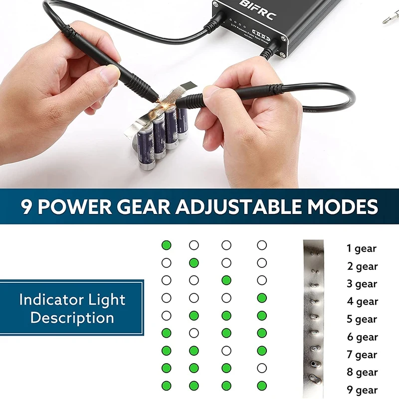 [Очевидный светильник индикатора] с выходной мощностью и оставшейся индикацией мощности, есть два режима вывода: 1.5s пусковой механизм синхронизации и автоматическое обнаружение выхода сварочного пера. Этот набор инструментов для точечной сварки имеет 4 двухцветных индикатора, а индикатор питания мигает при зарядке.