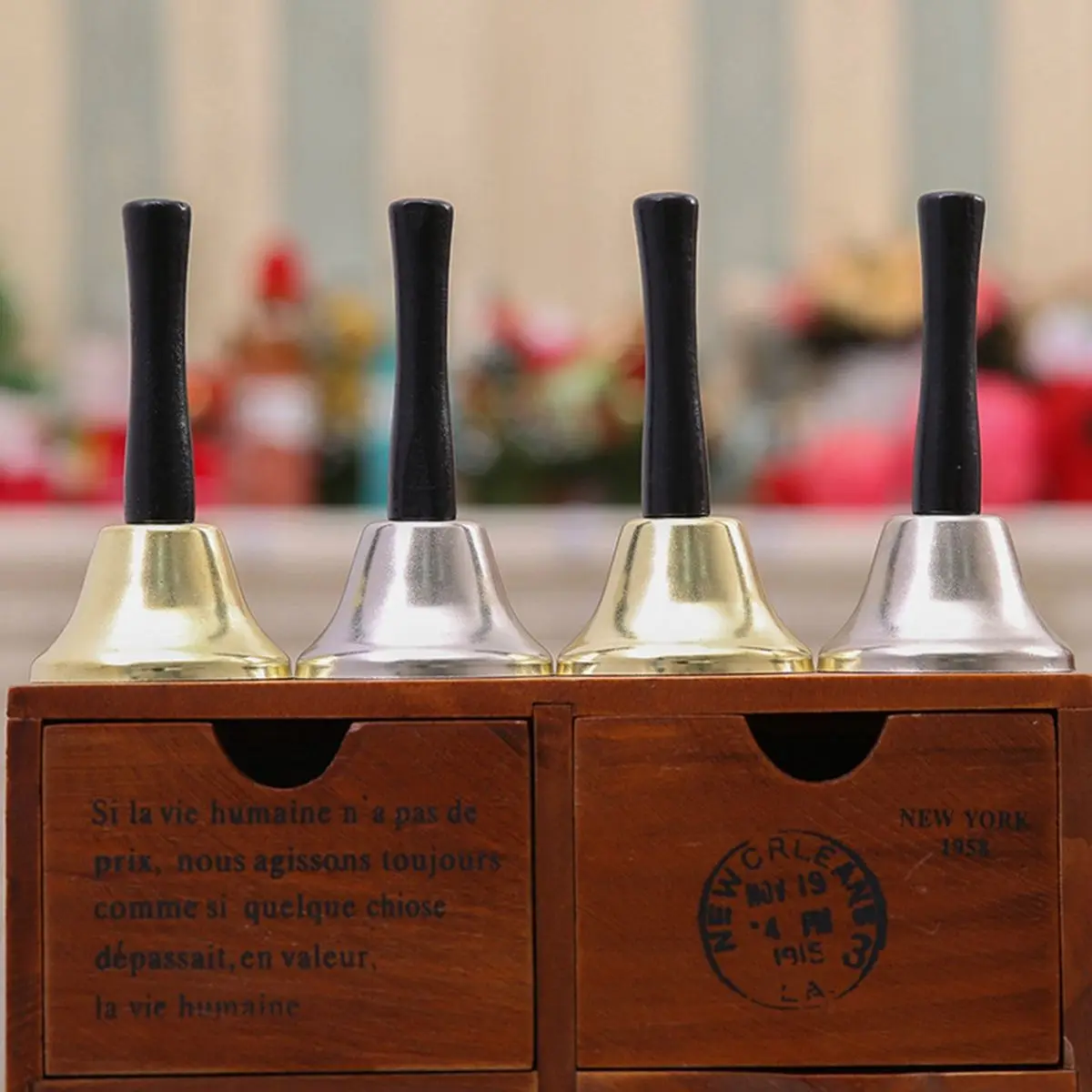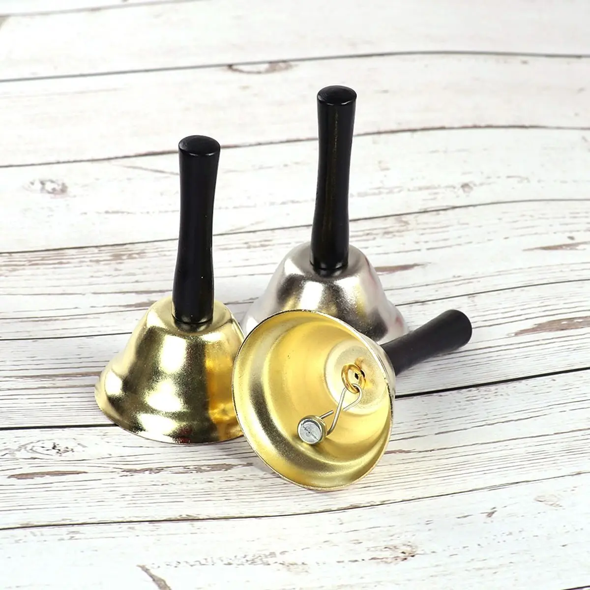 Размеры: 12X6,5 см/4,72X2,56" Цвет: Золотой/Серебряный Количество: 1 шт. Посылка включает в себя: 1 * ручной звонок Материал: металл + дерево Хороший материал, качающиеся колокольчики с хорошим звуком. Эргономичный дизайн ручки, удобный для захвата. Создайте атмосферу праздника.