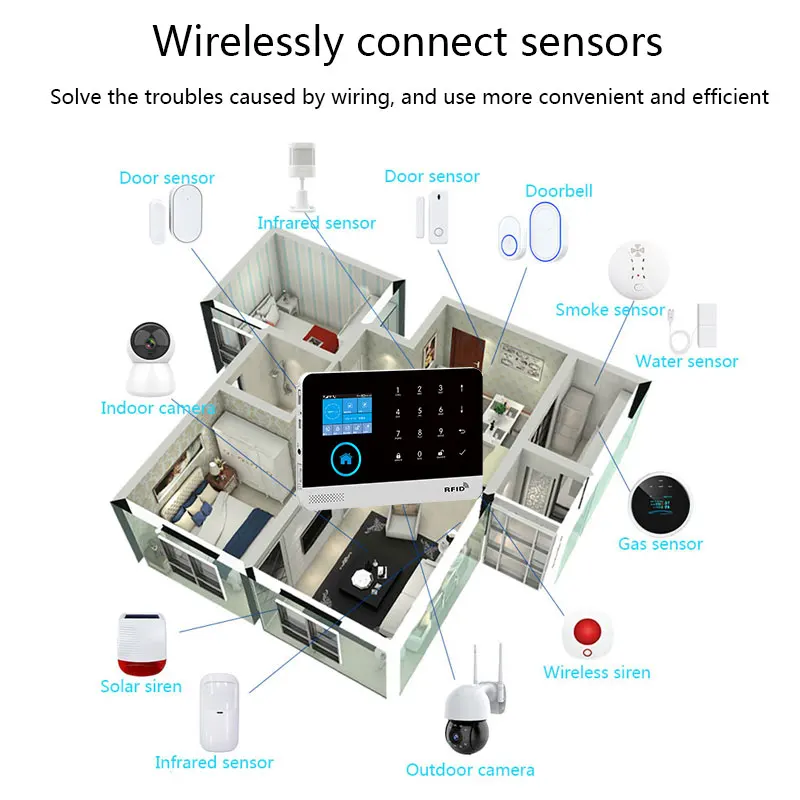 Система сигнализации Arm и disarm с вашим голосом и получать мобильные оповещения о двери/окна или дыма.