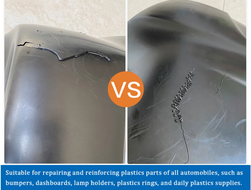 Хороший способ ремонта большинства современных изделий, изготовленных из пластмассы. Подходит для ремонта и армирования пластмассовых деталей всех автомобилей, таких как бамперы, панели приборов, держатели ламп, пластмассовые кольца и ежедневные пластмассовые принадлежности.