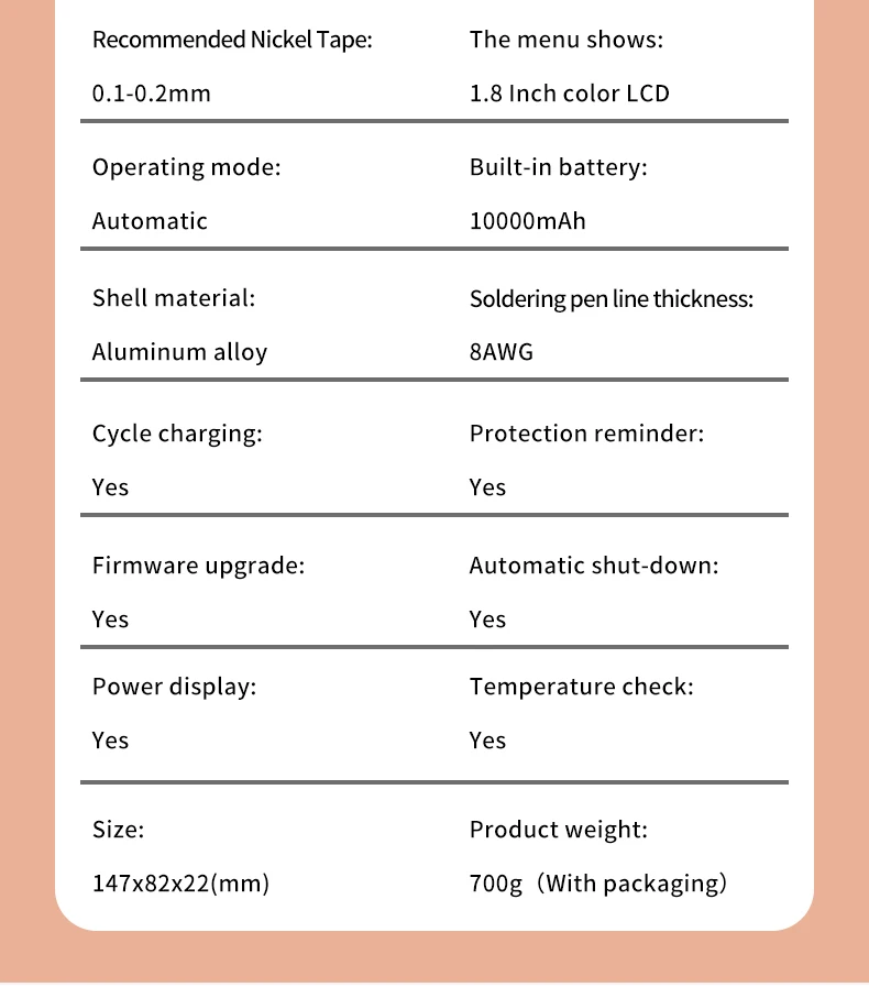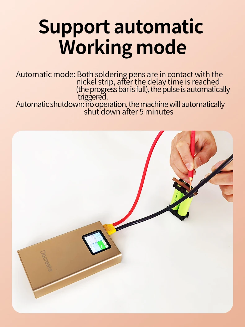 В SQ-SW2 машины для точечной сварки имеет 1,8-дюймовый ЖК-дисплей цветной экран дисплея, поддерживает автоматическое/ручной режим работы, с функциями низкого заряда батареи, мониторинг температуры печатной платы в режиме реального времени и напоминание о высокой температуре, флип-дисплей экрана, подсчет точечной сварки, автоматическое отключение, обновление прошивки и т. д.