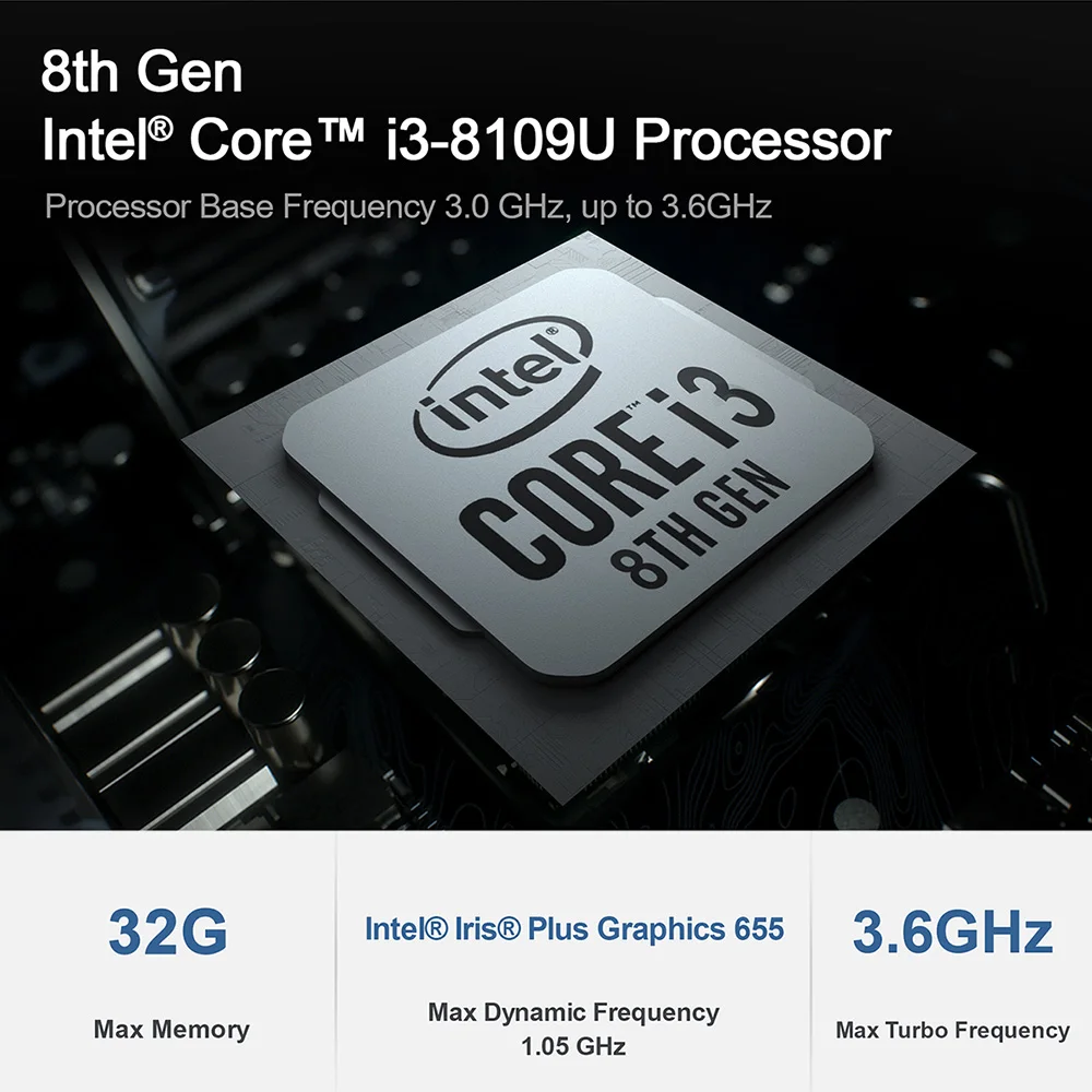 Intel Кофе озеро 8th core i3-8109U , 2 ядра 4 потока, 64 бит, 14nm 3,0 ГГц до 3,6 ГГц, Кэш-память 4м