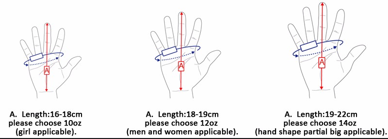 Каждый цвет имеет 2 различных уровня веса: 10 унций, 12 унций, пожалуйста, сравните размер пальца со следующей информацией перед покупкой, спасибо.