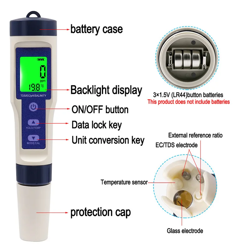 Это новый многофункциональный инструмент для проверки качества воды, который может измерять pH, TDS,EC, значение солености и температуру. Диапазон измерений большой и широкий, который может измерять соленость воды дома и морскую соль,Еда, сельское хозяйство, рыбный пруд, суп, морская вода и так далее.