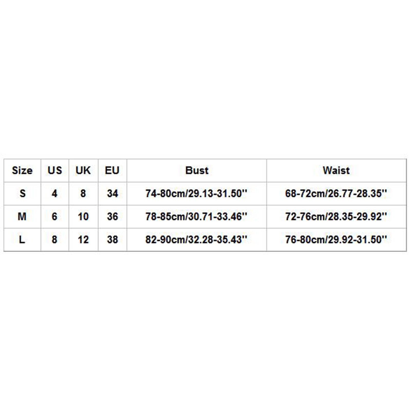 Пожалуйста, сравните детальные размеры с вашими перед покупкой! Цвета могут немного отличаться в зависимости от настроек компьютера и монитора Пожалуйста, учитывайте разницу в 1-3 см из-за ручного измерения, спасибо (все Размеры указаны в см, и, пожалуйста, примите во внимание, что 1 см = 0,39 дюйма) Таблица размеров:Размеры США Великобритания ЕС Бюст Талия S 4 8 34 74-80 см/29,13-31,50'' 68-72 см/26,77-28,35 дюйма М 6 10 36 78-85 см/30,71-33,46'' 72-76 см/28,35-29,92 дюйма L 8 12 38 82-90 см/32,28-35,43'' 76-80 см/29,92-31,50''
