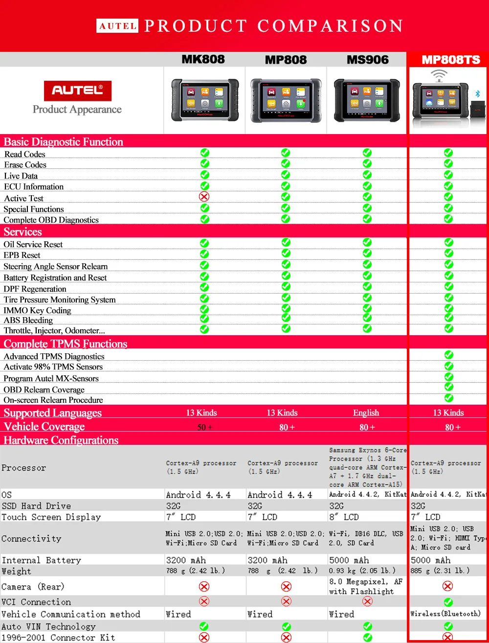 Autel сканер MP808TS поставляется с наиболее комплексными диагностическими функциями TPMS, которые держат управление давлением в шинах проверенного транспортного средства в топовом состоянии.