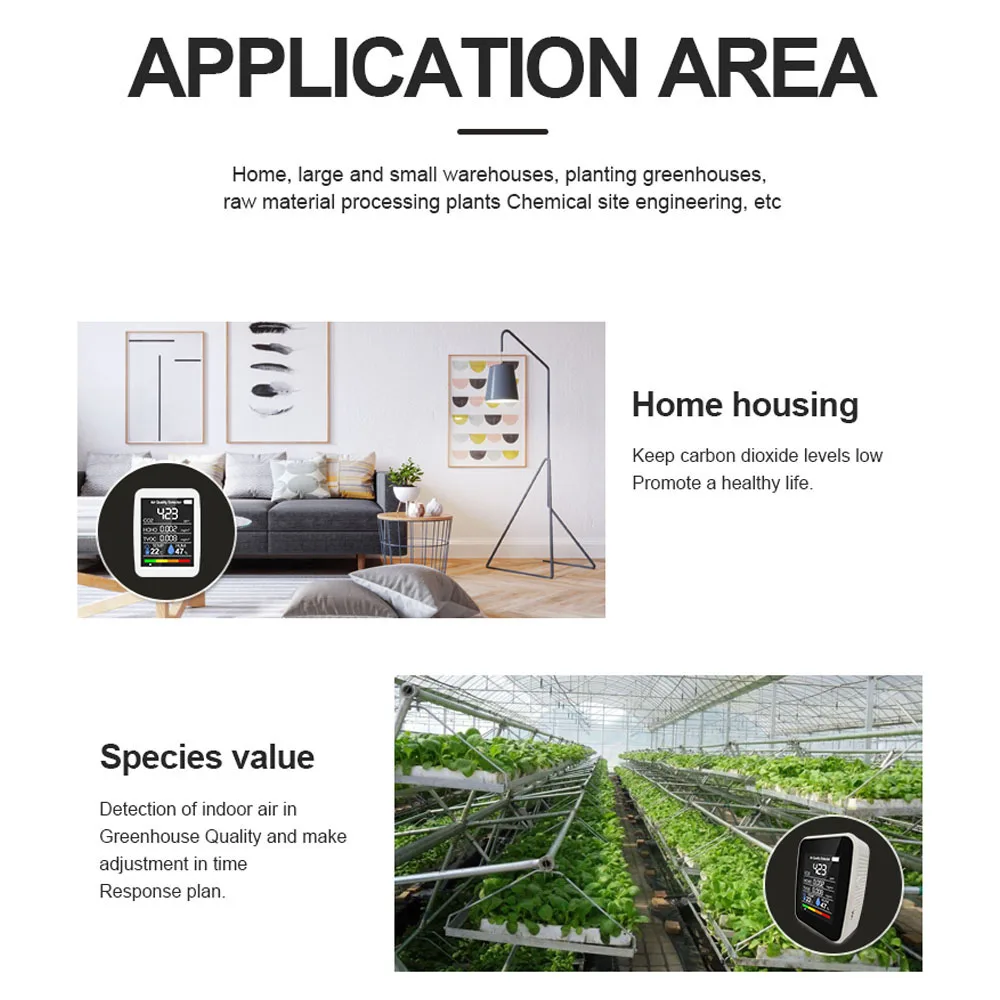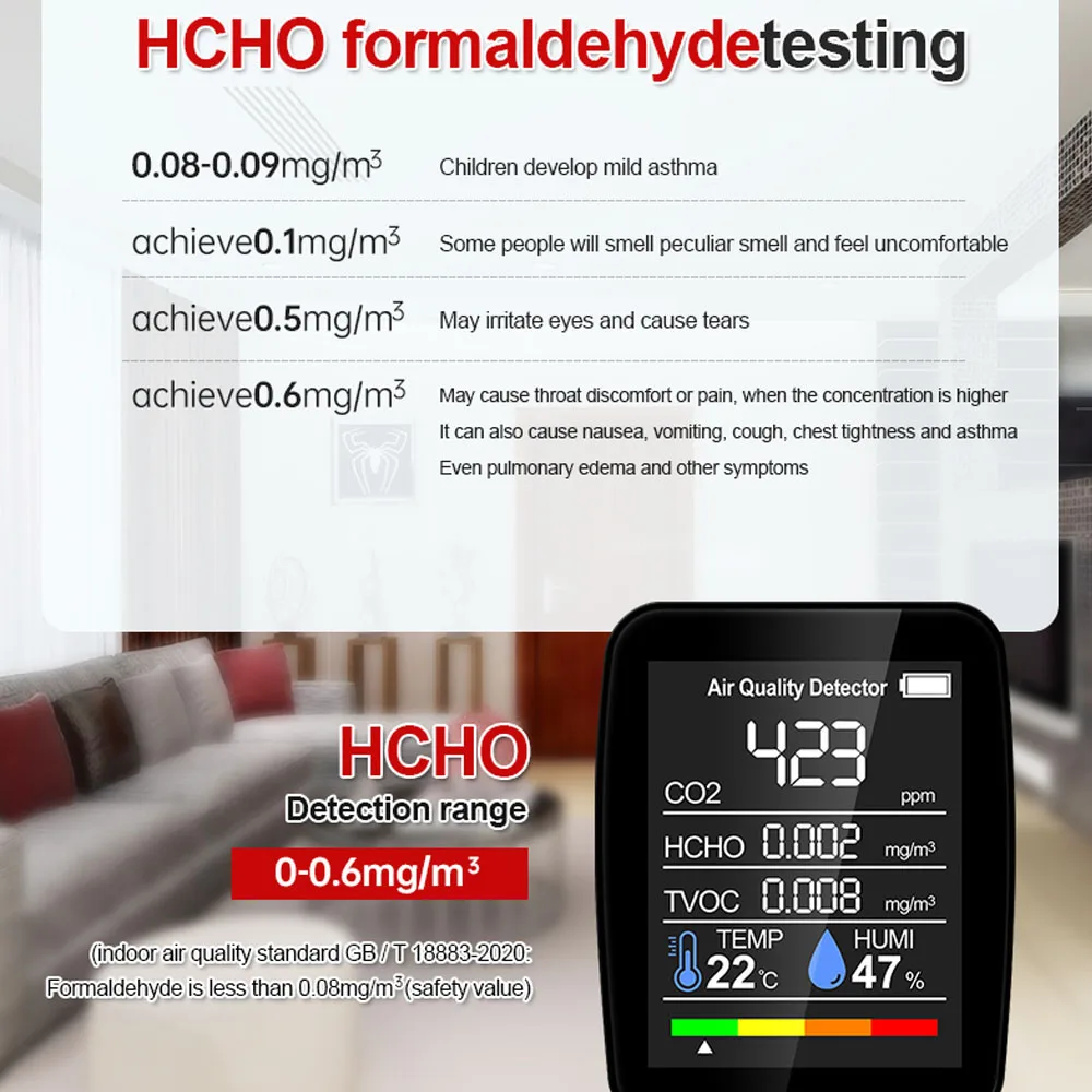Большой ЖК-дисплей с подсветкой, вы можете видеть количество электроэнергии, значение CO2, значение TVOC, значение формальдегида, температуру и влажность четко.