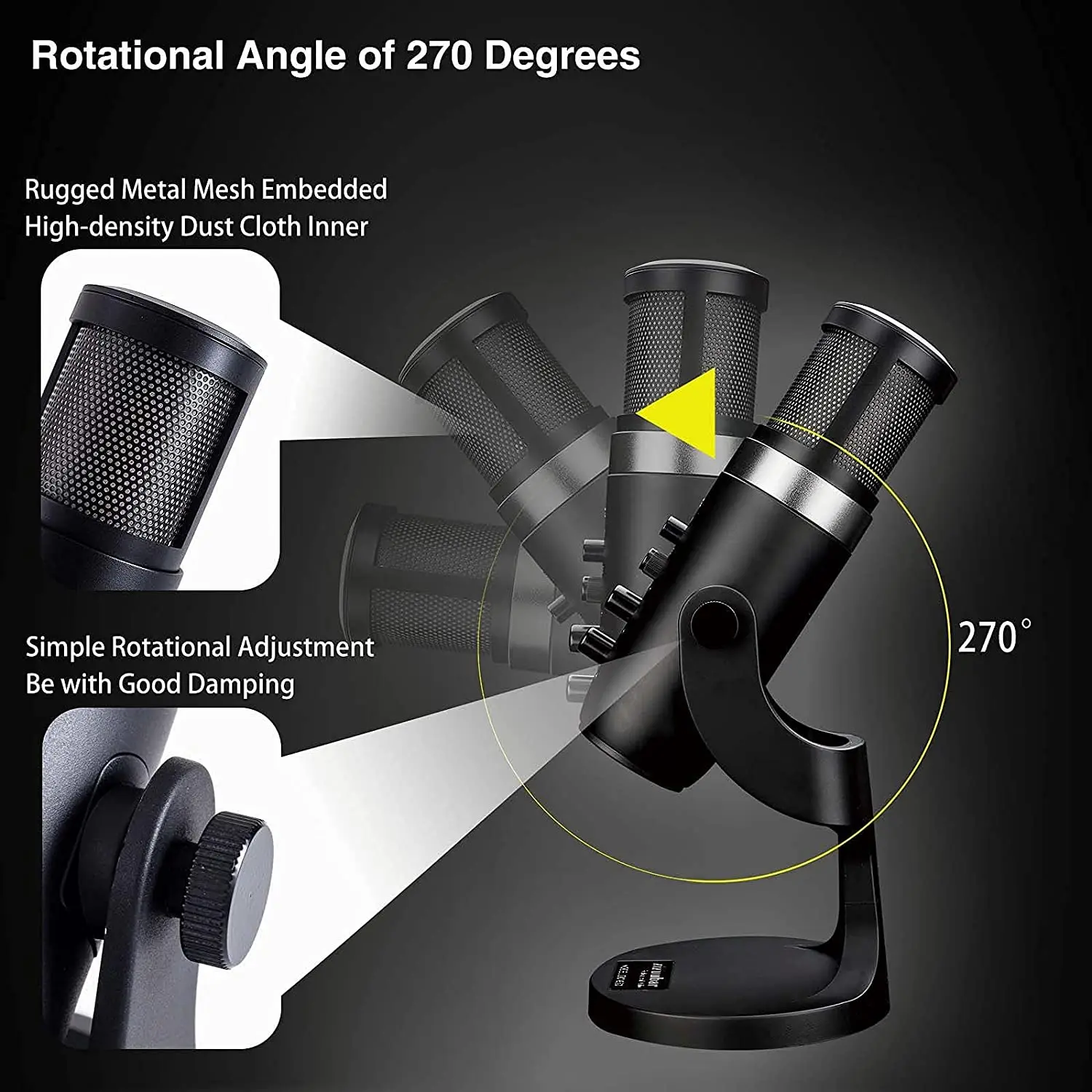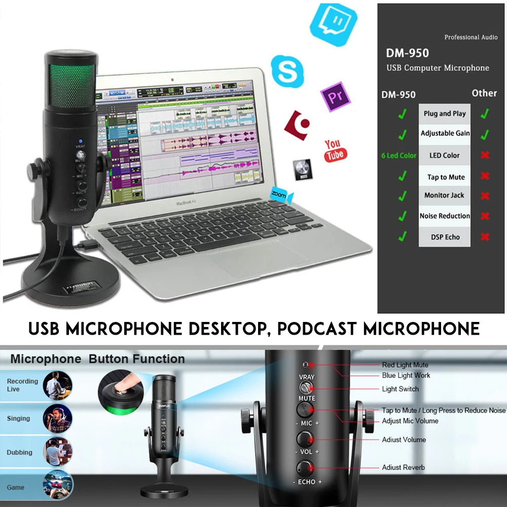 【Динамический RGB светильникКонденсаторный микрофон для подкастов имеет RGB Освещение и встроенный сенсорный бесшумный датчик. Используйте удобную сенсорную функцию отключения звука для предотвращения несчастных случаев с помощью светодиодный индикатор состояния микрофона. Если синий светильник, микрофон активен, если красный светильник, микрофон приглушен.