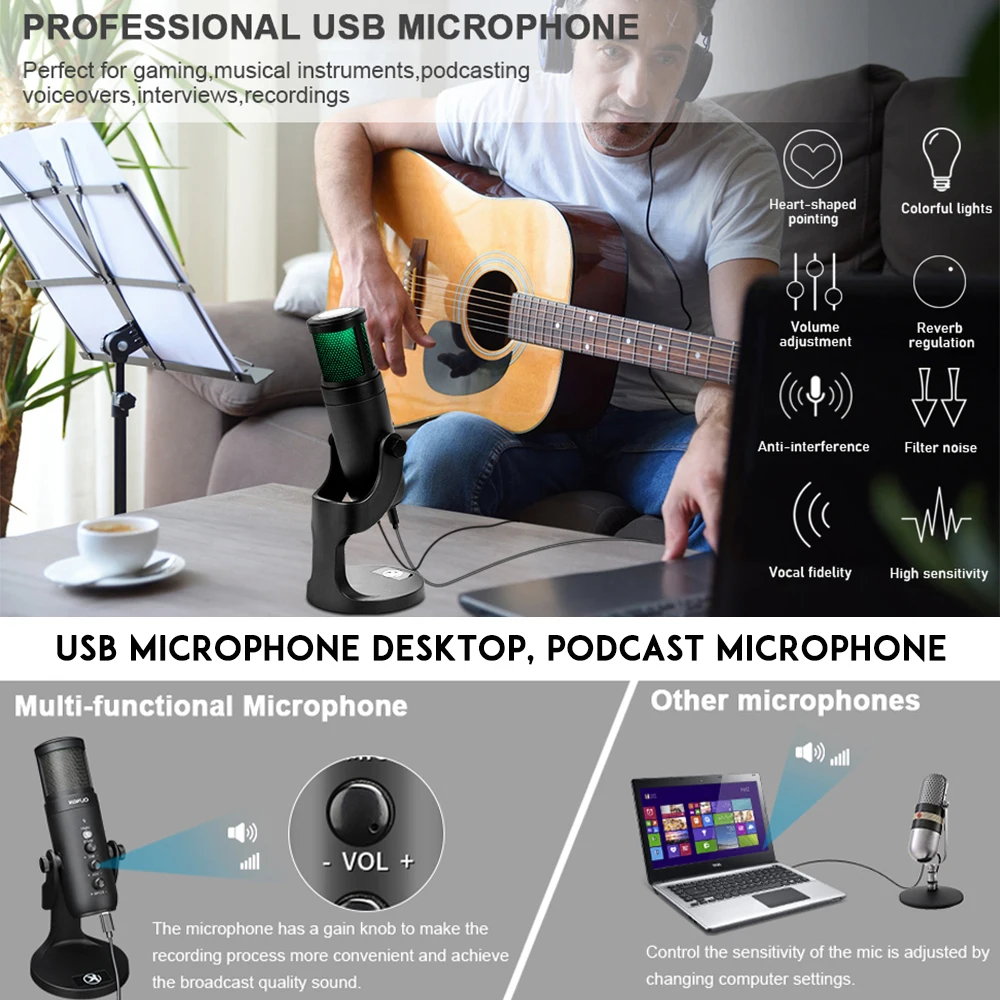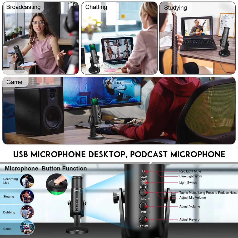 【Шумоподавление USB микрофона 】Кардиоидный микрофон имеет встроенный чип снижения уровня шума следующего поколения. Просто нажмите и удерживайте кнопку «Mute» в течение двух секунд, и Функция шумоподавления включается. Переключатель шумоподавления подходит для фильтрации шума в шумной среде, снижения уровня шума и высокой точности вывода. Сохраняя надоедливый фоновый шум из ваших видео.
