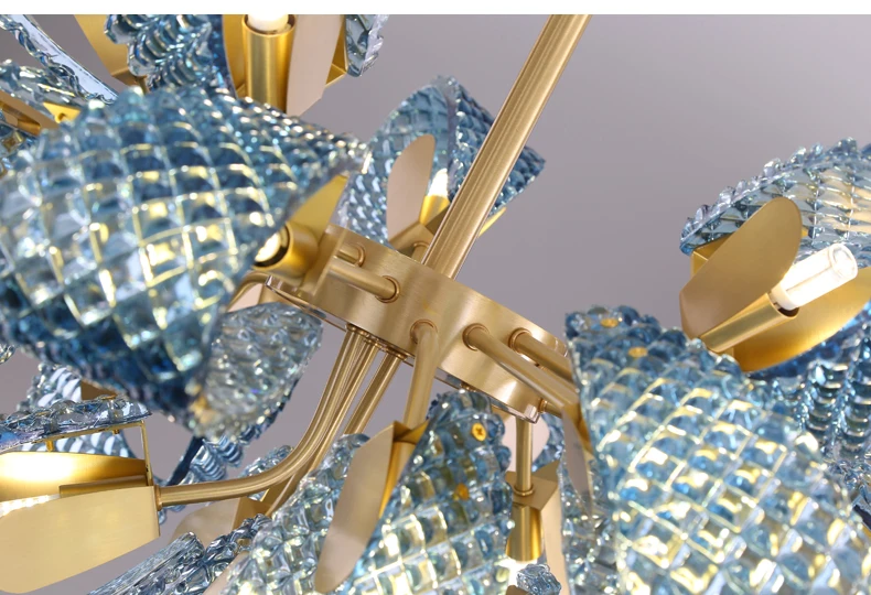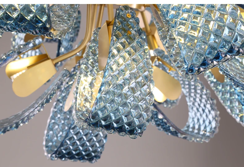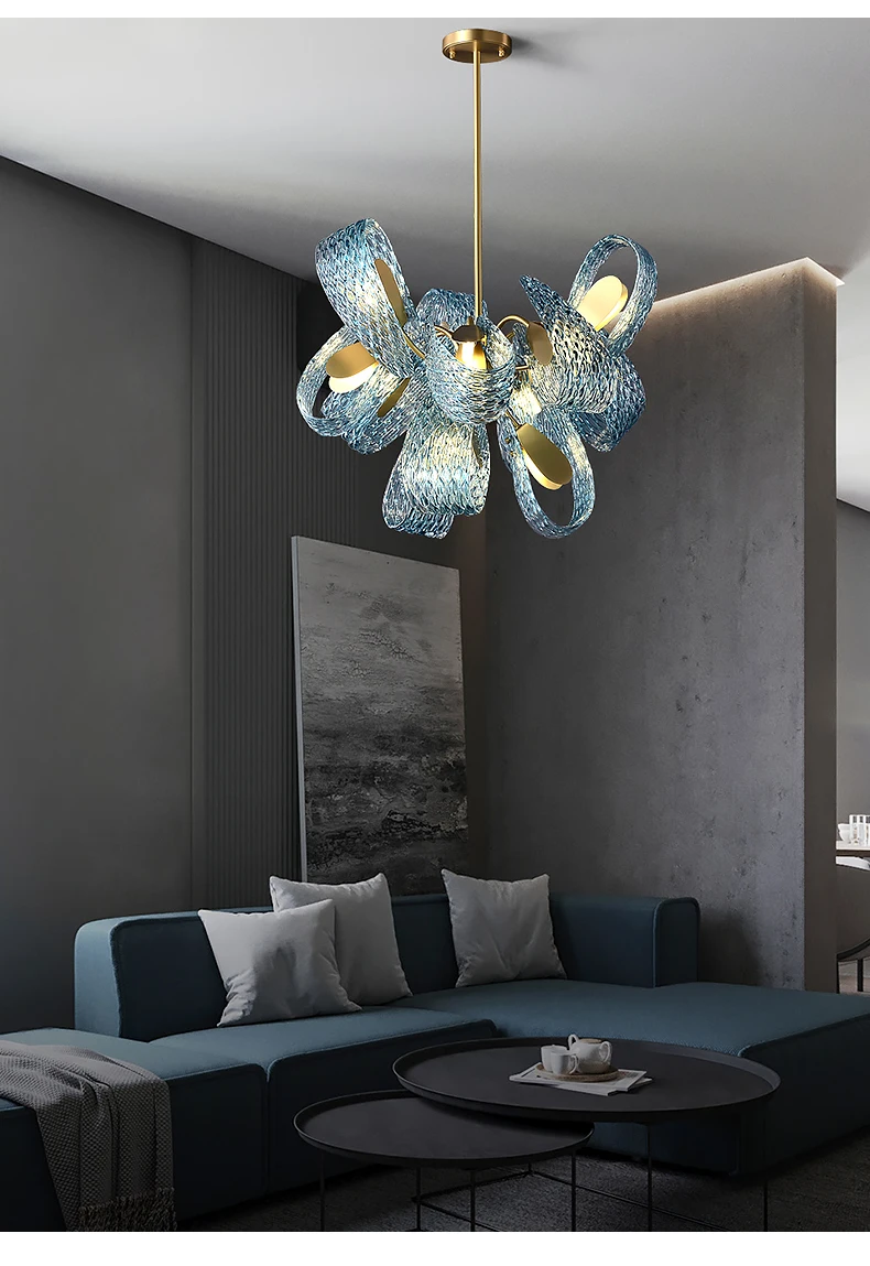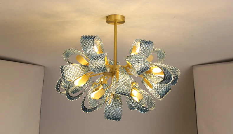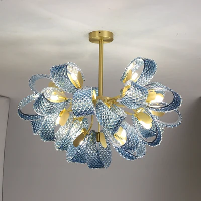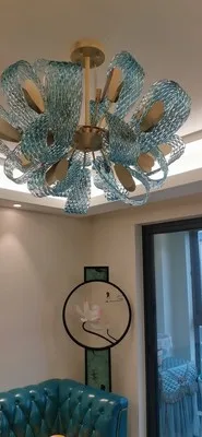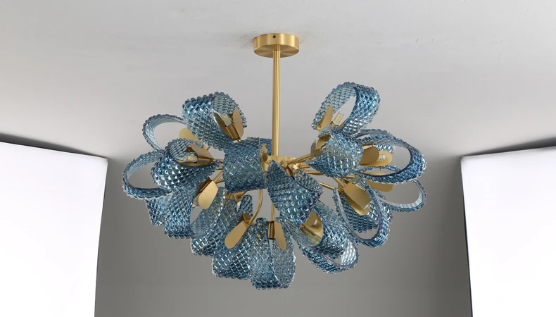 Художественный светодиодный подвесной светильник синего цвета из стекла и меди для фойе