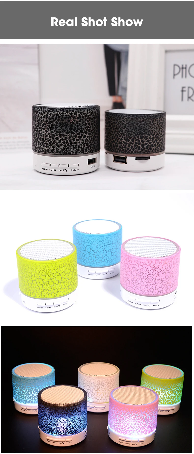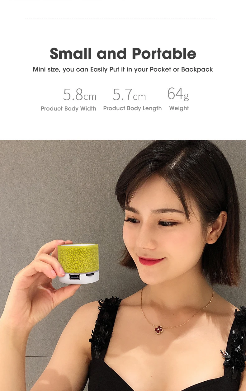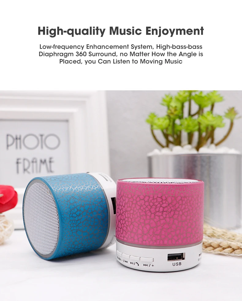 Характеристики: 1. Уникальный внешний вид трещины, светодиодный динамик с цветными лампами bluetooth.<;br/>2. Беспроводная передача Bluetooth, без поддержки звонков. 3. Поддержка u-диска, tf-карты, аудиовхода.<;br/>4. Может быть подключен к компьютеру, мобильный телефон, MP3 и т. д. <;br/>5. Большая емкость, большой объем, высокая мощность и мощность.<;br/> Спецификация: Тип динамика: портативный динамик bluetooth. Материал: АБС-пластик. Цвет: черный, белый, синий, красный, зеленый. Режим питания: 5 В; Встроенный аккумулятор (300 мА). Эффективная мощность: 3 Вт. Размеры: 6X6X6cm. Вес: 100 г. Дальность передачи: до 10 метров (Данные измеряются в открытых и свободных областях, стены и здания могут повлиять на передачу сигнала).