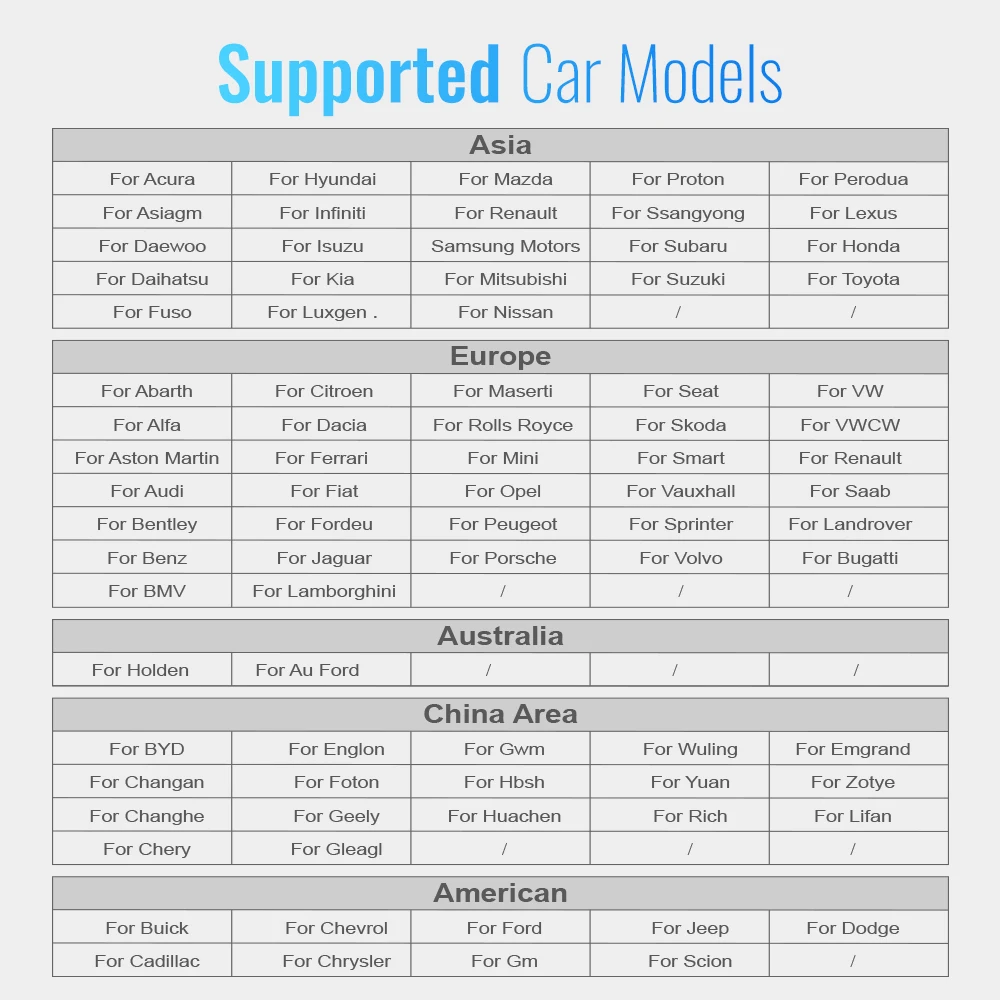 Для Audi, для Benz, для BMW, для Ford, для Honda, для Hyundai, для Jaguar, для Kia, для Land Rover, для Lexus, для Nissan, для Porsche, для Buick, для Subaru, для Toyota, для VW