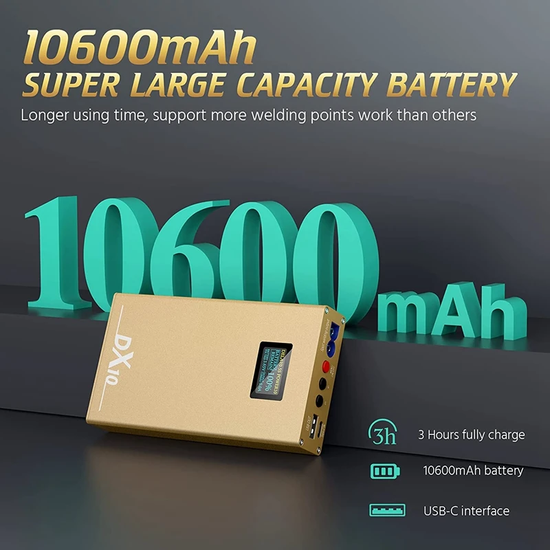 [10600 мАч большой дизайн батареи]: Этот перезаряжаемый точечный сварщик с мини-портативным размером, но с емкостью аккумулятора 10600 мАч, может быть полностью заряжен в течение 3 часов, не нужно часто заряжать, может держать более длительное время точечной сварки, чем другие. Более того, этот мини точечный сварщик может использоваться в качестве банка мощности, когда вам нужно зарядить телефон.