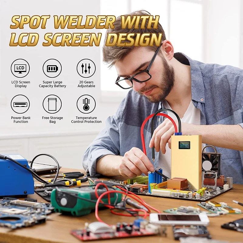 [Специальный дизайн ЖК-экрана]: наш аппарат для точечной сварки недавно разработан с видимым ЖК-экраном, легко проверяет задержку секунд и передач, также можно проверить выход, входное напряжение и оставшуюся батарею. Вы можете использовать его для большего удобства и безопасности.