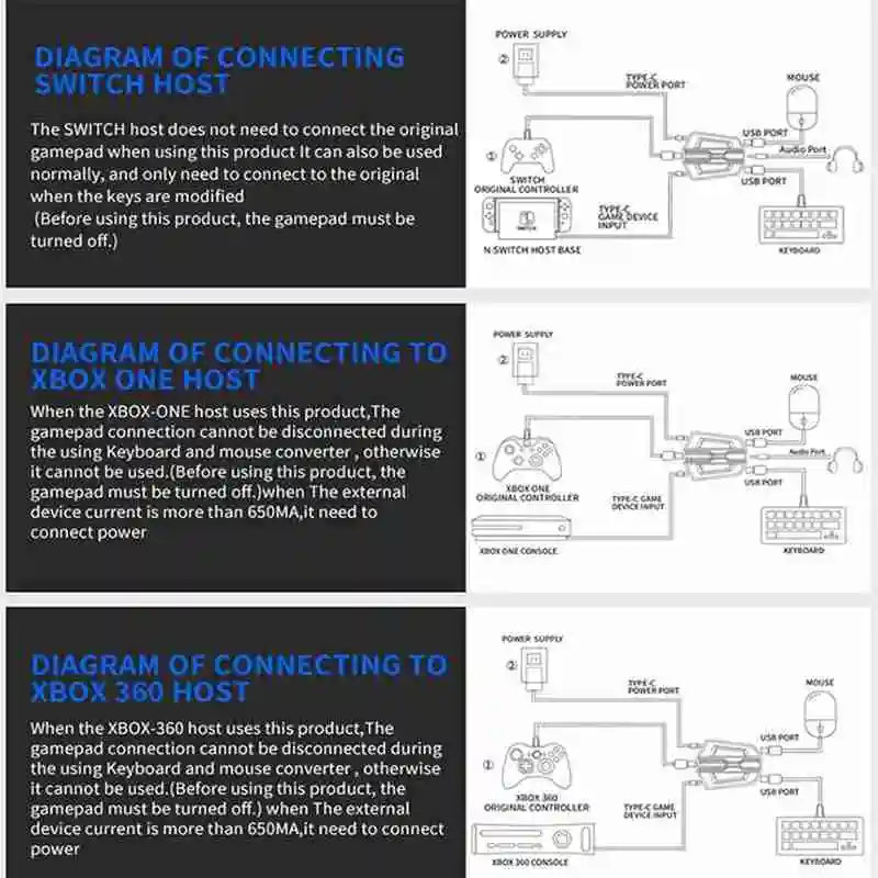 Характеристики:<;br/>* Совместимость с хостом платформ PS4/PS3/Xbox One/Xbox 360/N-Switch.<;br/>* играйте быстрее и точно с помощью мыши и клавиатуры, чем с ручками.<;br/>* Нет кнопки включения/выключения питания, plug & amp; Воспроизведение благодаря простой установке <;br/> поддерживает функции клавиатуры и мыши, настройка скорости мыши, И мышь Y-axis Переключатель направления.<;br/>* четырехцветный светодиодный дыхательный светильник указывает на состояние подключения и увеличивает атмосферу игры.<;br/> Как подключить:<;br/>1. Запустите консоль и подключите адаптер через usb-кабель для передачи данных типа C (разъем usb-порта к консоли, разъем порта Type-C к конвертеру), а затем светодиодный светильник белого цвета.<;br/>2. Подключите оригинальный проводной геймпад и желтый светодиодный светильник. Вставьте клавиатуру, затем светодиодный светильник красного цвета; Вставьте мышь, затем светодиодный светильник зеленого цвета. После завершения всех соединений светодиодный индикатор будет дышать в циркуляции от желтого, голубого, фиолетового и розового цветов.<;br/> Примечание: Пожалуйста, внимательно прочитайте руководство пользователя перед подключением и установкой, потому что существует небольшая разница между различными хостами.<;br/> Спецификация:<;br/> Модель: SW315<;br/> Название позиции: конвертер клавиатуры мыши <;br/> Интерфейс продукта: интерфейс зарядки Type-C <;br/> Номинальное напряжение/ток: DC 5 в 100 мА <;br/> подходящие игровые консоли: совместимость с PS4/PS3/Xbox One/Xbox 360/N-переключатель <;br/> Цвет: черный <;br/> Материал: ABS<;br/> Упаковочный лист:<;br/>1 * конвертер клавиатуры мыши <;br/>2 * кабель Type-C (длина 30 см и 95 см)<;br/>1 * Руководство пользователя (на английском/китайском языке)<;br/><;br/> Спасибо за вашу поддержку! Добро пожаловать, чтобы купить у нас! Если вы хотите купить больше, чем мы указали, пожалуйста, свяжитесь с нами. Мы будем готовы ответить вам как можно скорее.