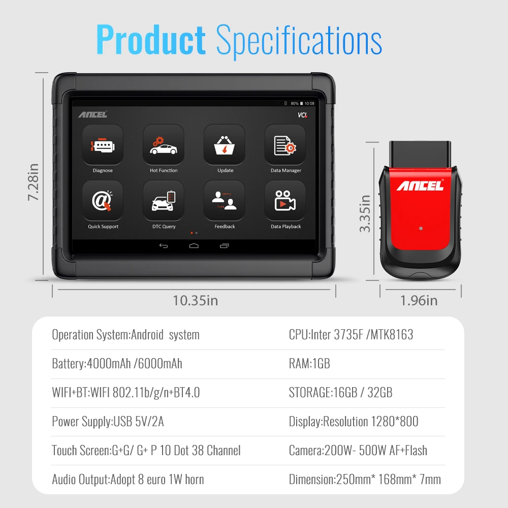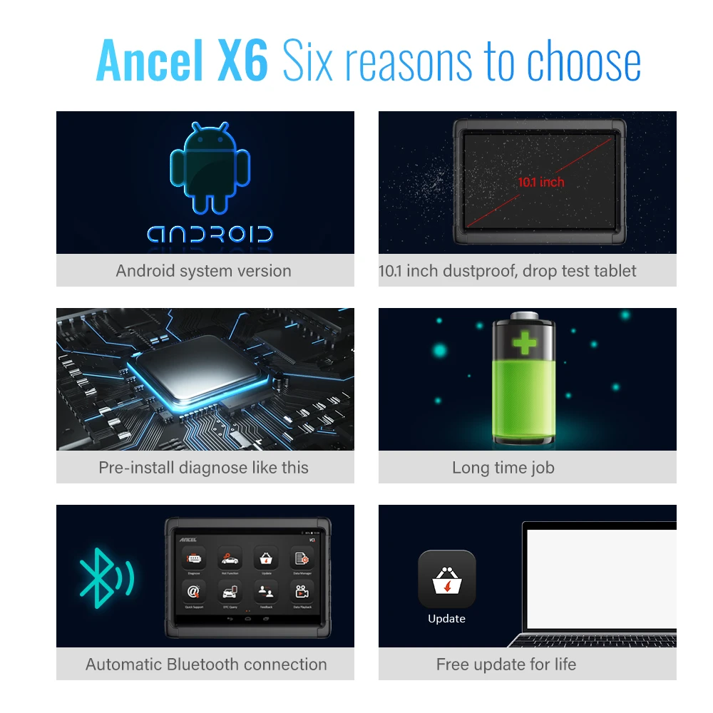 ANCEL X6-это новый усовершенствованный универсальный автомобильный диагностический инструмент с дисплеем планшета android. Его можно использовать напрямую без установки программного обеспечения. Поддержка 10 специальных функций сброса. Поддержка более 10000 моделей автомобилей по всему миру. Это дизайн гаража для ремонта автомобилей, салонов красоты автомобилей, автомехаников и владельцев автомобилей DIY.