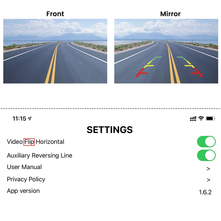 * Может использоваться как фронтальная, так и камера заднего вида --- по умолчанию Беспроводная камера производит зеркальное изображение (для заднего вида), если вы хотите, чтобы изображение не было зеркальным (для переднего вида), вы можете изменить настройки для достижения этого.