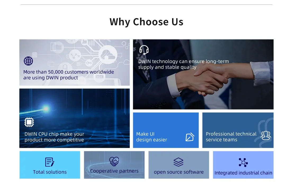 Основные технологии взаимодействия человека-машинки, технология DWIN в основном для промышленной ЖК-панели, TFT ЖК-модуль, HMI дисплей и сенсорный экран, обеспечивают решение всей линейки продукции, техническая консультация и послепродажное обслуживание для всех видов дисплейного модуля, предлагаем панель HMI, промышленный дисплей s, интерактивная сенсорная панель, емкостный/резистивный сенсорный экран s. Наши сенсорные панели размерный ряд входят размеры от 1,54 дюймов до 21,5 Дюймов, может быть применена к новой энергии, банковское оборудование, проектируя машинное оборудование, медицинские инструменты, промышленное оборудование и потребительские электротехнической продукции. Мы можем быть вашим лучшим партнером для двойной выгоды.