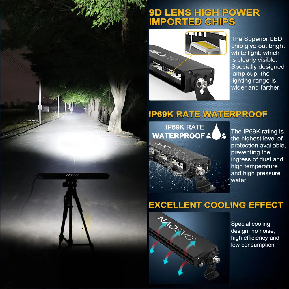 Улучшенный светодиодный чип Osram и комбинированный пучок однорядной без винтовой конструкции, более концентрированный светильник и дополнительная область облучения. Убедитесь, что вы четко видите дорогу и безопасно ездите ночью.