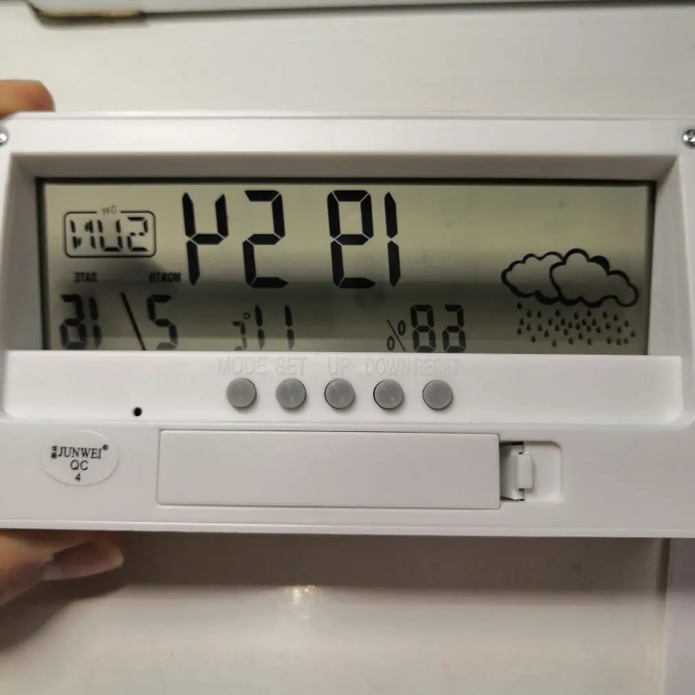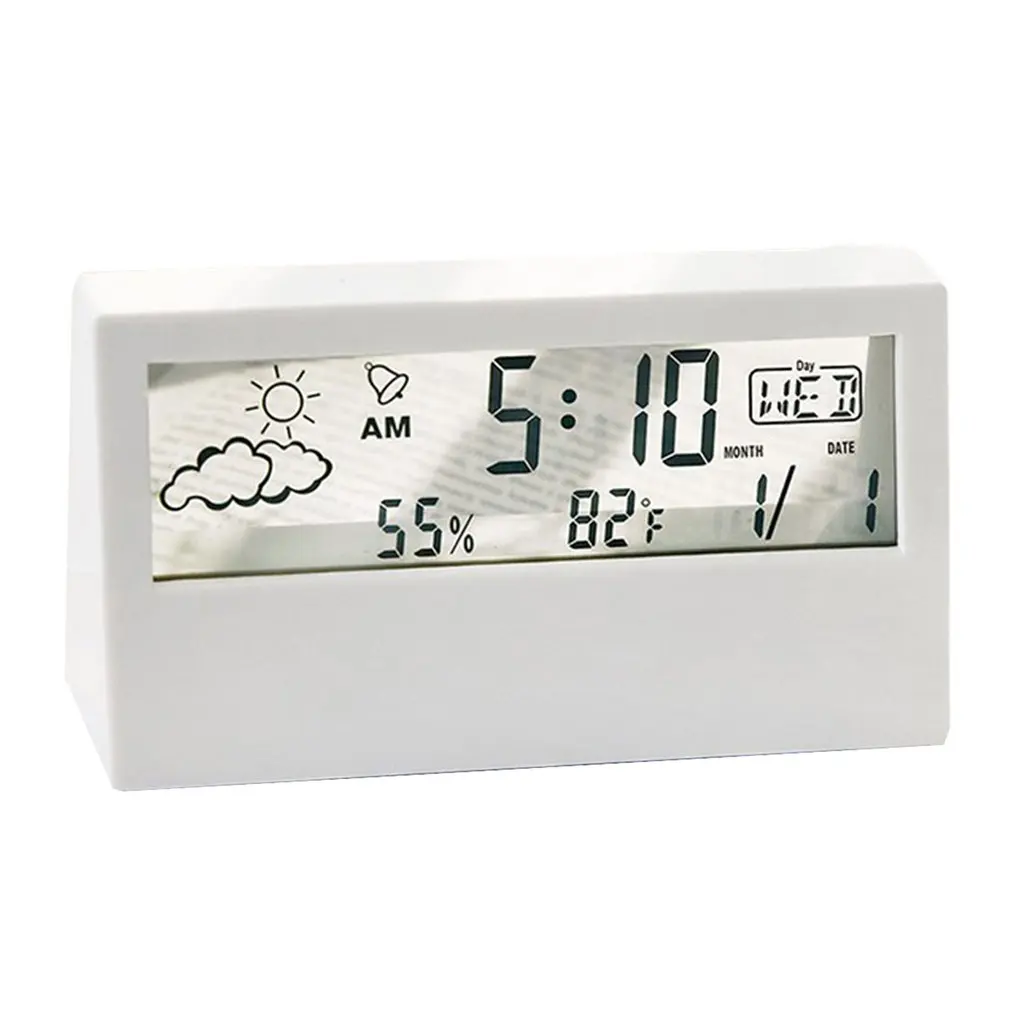 Features: 1. Indoor temperature and humidity display: Check the conditions to properly dress or Increase or decrease moisture. Indoor temperature and humidity display with selection of °C and °F. 2. 24-hour weather forecast: self-calibrated 24-hour weather forecast, predictions are based on humidity changes. 3. Alarm clock and snooze function: This multifunctional product supports setting an alarm clock in advance to avoid oversleeping. 4. Small and stylish appearance: This clock has a modern transparent screen, which adds functionality and decoration to your home. 5. Long battery life: This product uses 2 replaceable button batteries, the battery life is up to 1 year, long-term use. Description: This household thermometer and hygrometer supports setting of alarm clocks and can provide 24-hour weather forecast, which is convenient for furniture and office use. Specifications: Battery: 2 * G13 Cell Battery (included) Voltage: 3V Life time: More than 180 days Calendar display: hour, minute, year, month, date, day Time display: 12hr/ 24hr Alarm clock function: Alarm and snooze function Temperature unit Switch: ℉/℃ Temperature display range: -20℃~60℃ Humidity display range: 20%RH-89%RH Weather display: Sunny, cloudy, rainy Display type: Transparent display Material: ABS Package Included: 1 * Transparent Screen Weather Station With Cell Battery