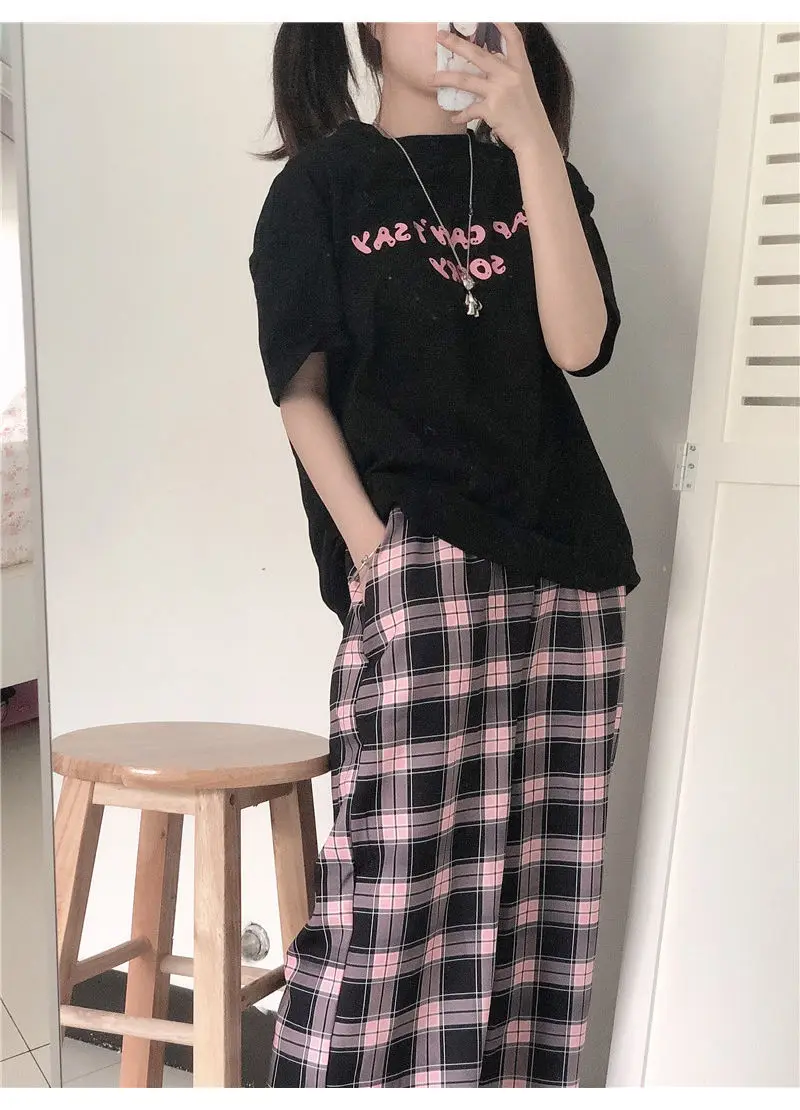 Розовые клетчатые брюки оверсайз женские 2022 Новые повседневные Прямые брюки для девочек хип-хоп Уличная одежда Ins Ретро свободные широкие брюки