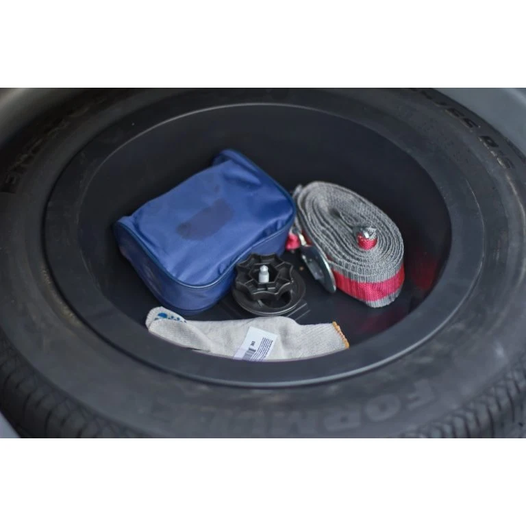 Для установки органайзера необходимо открутить пластиковый фиксатор и перевернуть запасное колесо. В образовавшуюся нишу необходимо установить пластиковый органайзер и зафиксировать его пластиковым фиксатором. Монтаж производится без использования дополнительных фиксаторов: двустороннего скотча и лип-фиксаторов.
