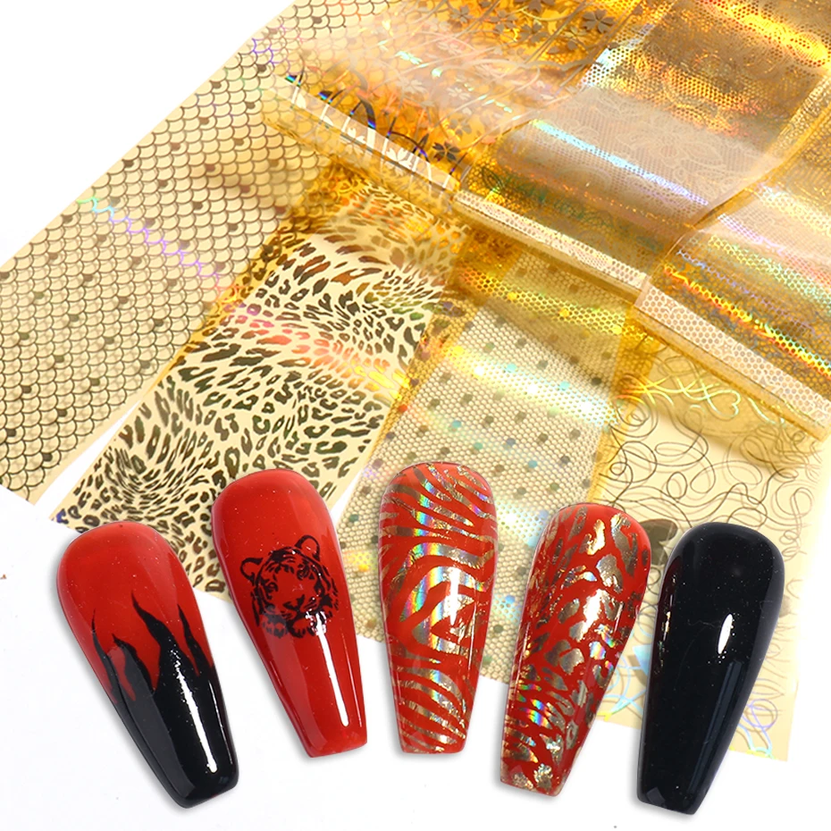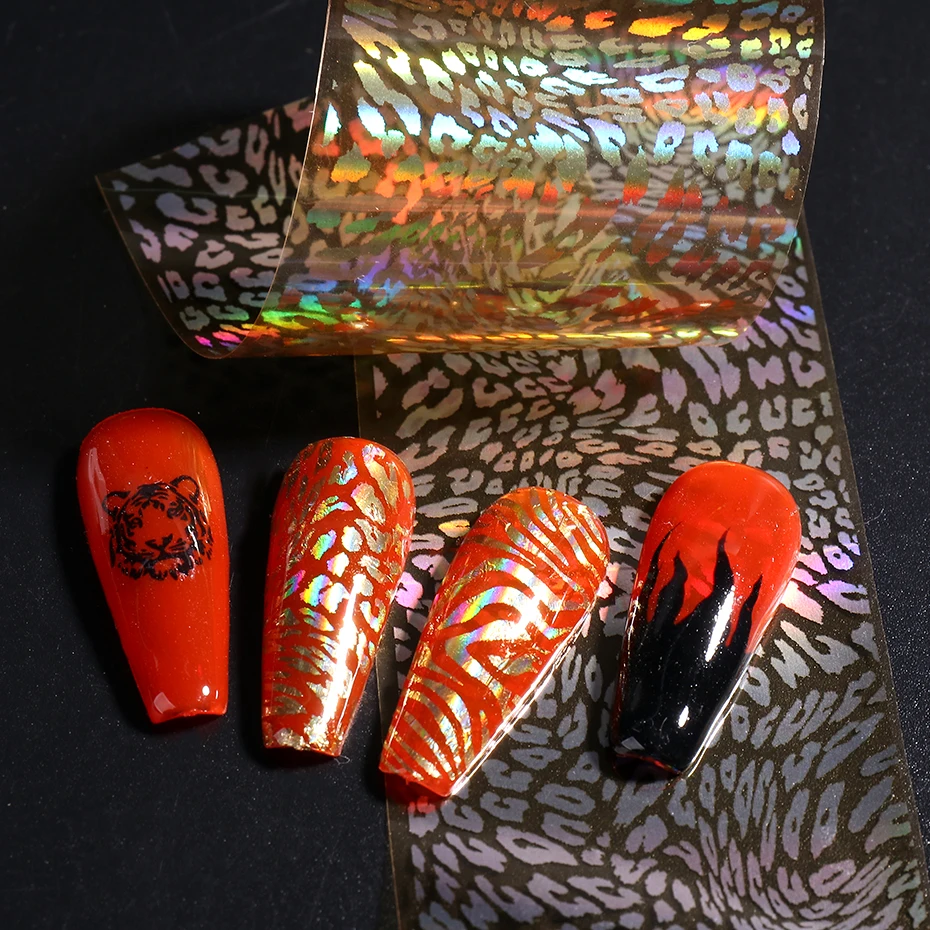 Золотой Лазерная Фольга наклейки для ногтей на новый год Тигра Animnals кожи, которые могут изменить свой цвет голографический модные ногтей передачи ползунки