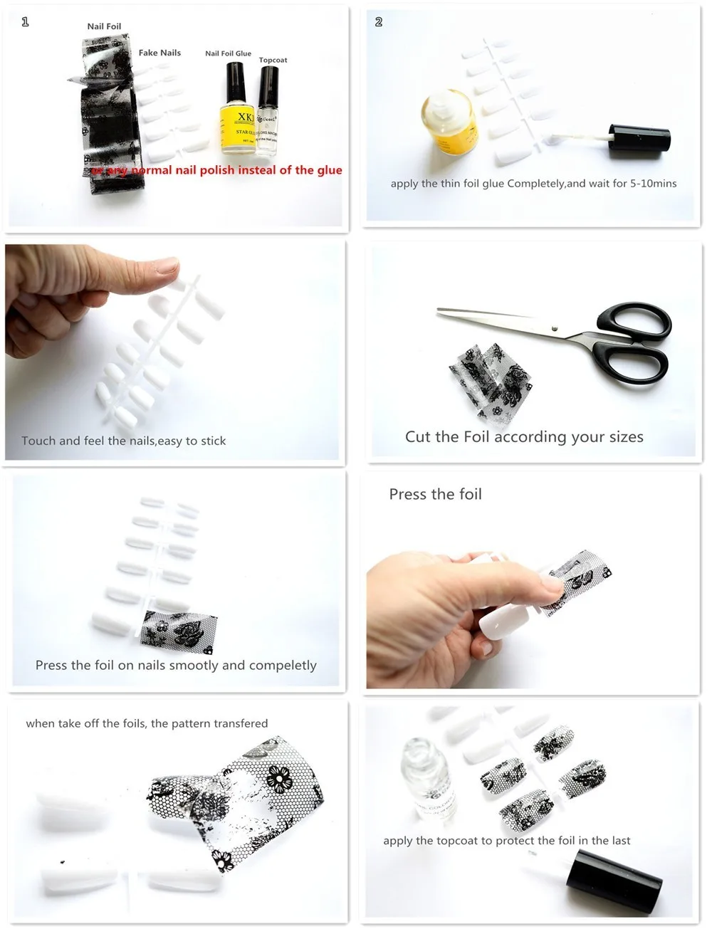 2. Вырезать и пресс-фольга для ногтей, для нанесения с помощью клея гладко.
