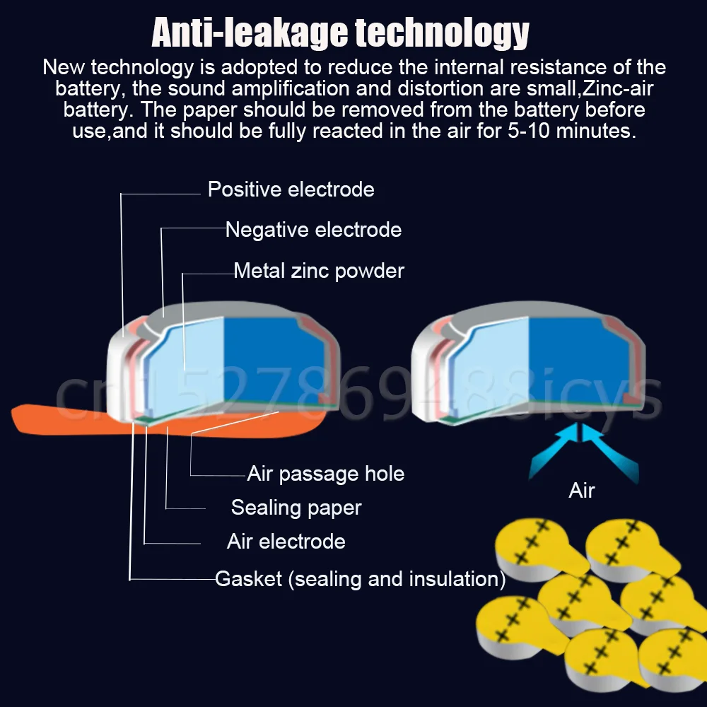 2. Батарея слухового аппарата-это цинк-воздушная батарея. Бумага должна быть удалена из батареи перед использованием, и она должна быть полностью отреагирована в воздухе в течение 5-10 минут, И напряжение должно повышаться до стабильного значения перед тестированием или использованием.