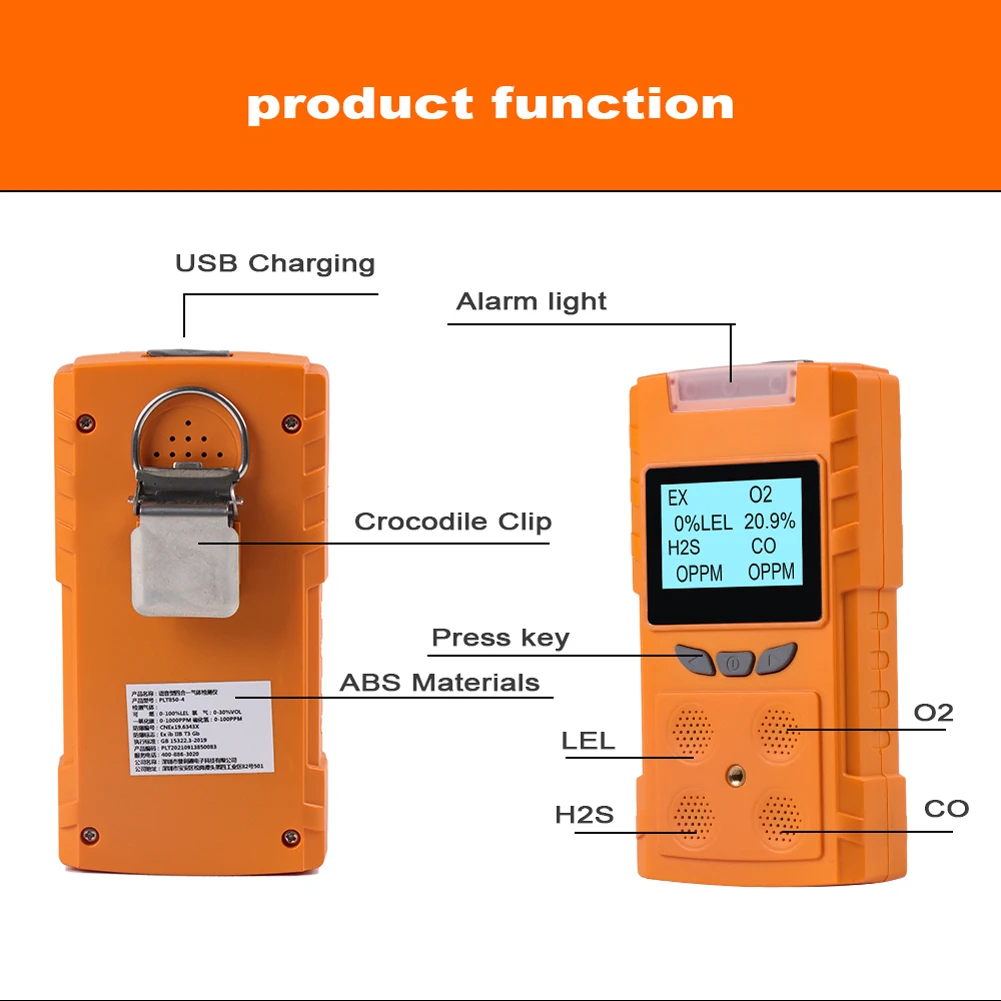 4 в 1 детектор газов:Этот детектор газов может контролироватьОкиси углерода, H2S, O2 и горючих газов одновременно.