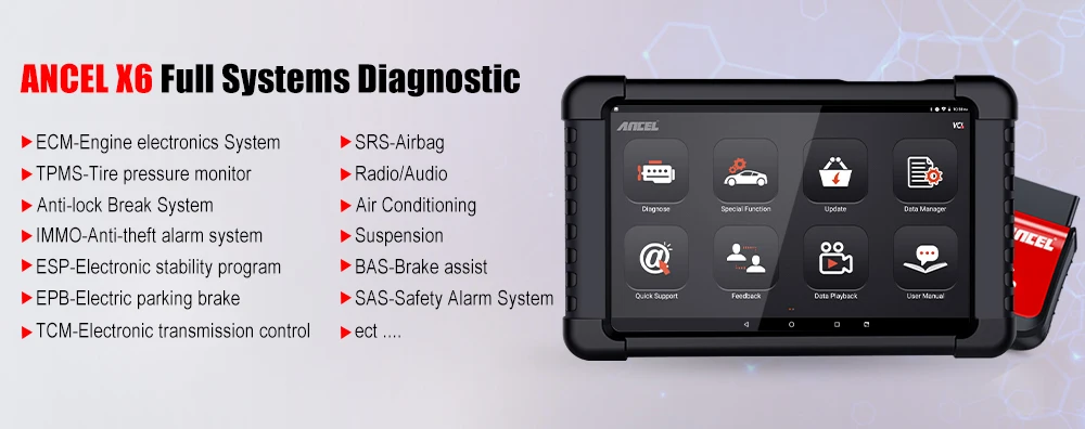 Ancel X6 10,1 дюймового планшета obd2 сканер способен чтение и очистка кодов неисправностей всех основных систем, включая двигатель, подушка безопасности/ПП, коробка передач, ABS, SAS, кондиционер, ACC аудио, фары, центральный замок, ESP, сбои подвески и т. Д.