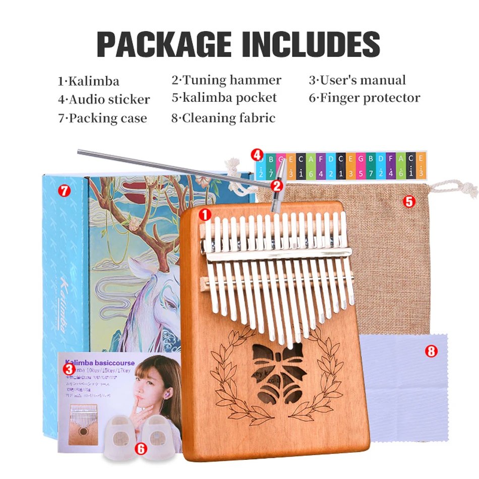 ♫Продукт включает в себя: фортепиано большого пальца, мелодию молота, инструкцию, наклейки, мешок, ткань для очистки.